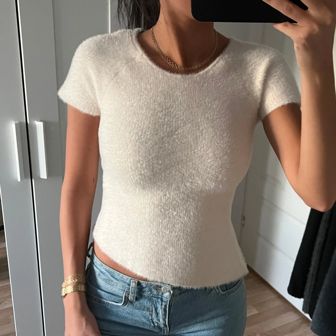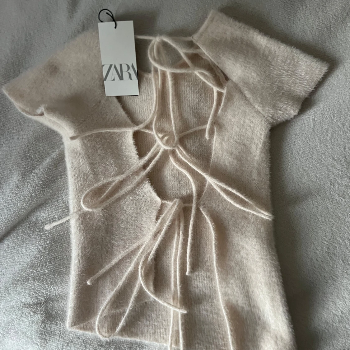 Supermjuk och fluffig vit topp från Zara med korta ärmar och snygg snörning i ryggen. Helt ny, kommer i mycket bra skick.