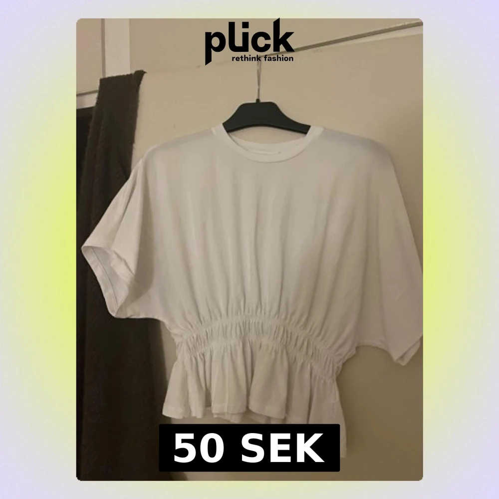 Säljer en vit blus med rund hals och korta ärmar. Toppen har en croppad passform med smockad midja och volang nedtill som ger en snygg siluett. Materialet är mjuk bomull och toppen är helt enfärgad utan mönster. Perfekt för dig som gillar stilrena och trendiga plagg.