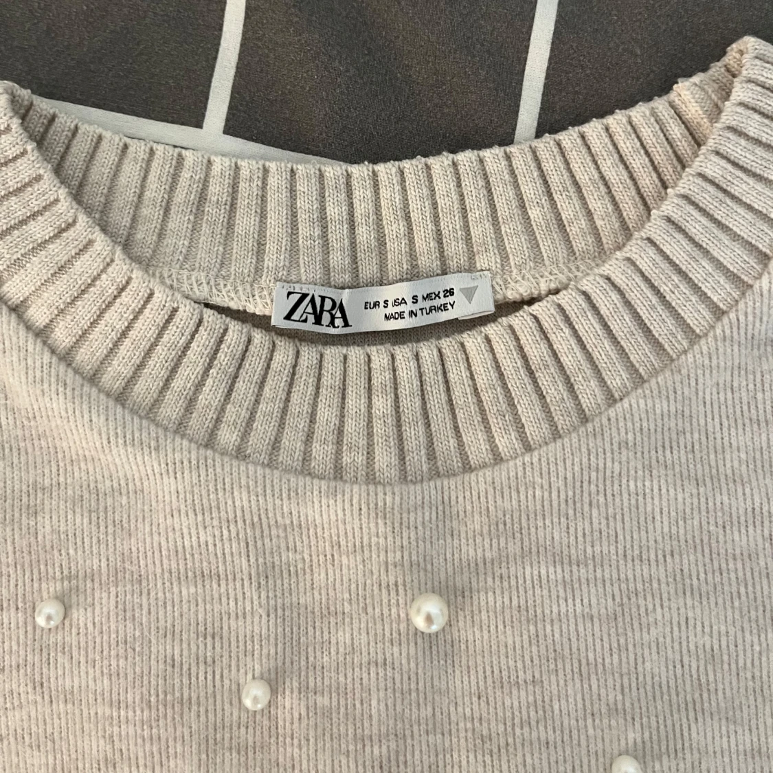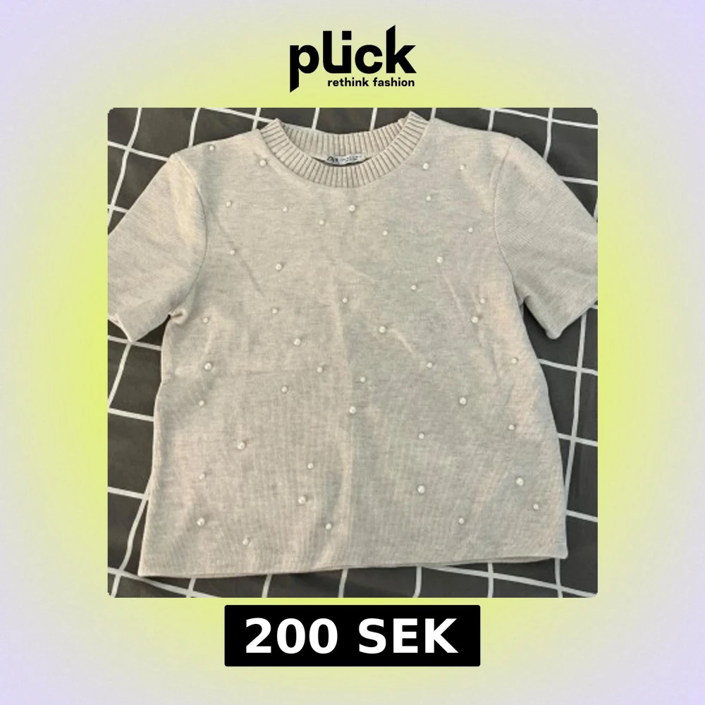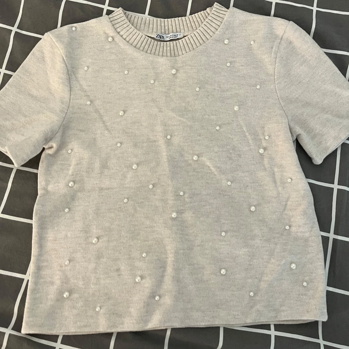 Superfin beige topp från Zara med korta ärmar och rund hals. Toppen är dekorerad med pärlor på framsidan för en extra touch. Materialet är ribbad och känns mjukt mot huden. Storlek S men jag upplever den liten i storlek och mer som en Xs. Helt ny och aldrig använd. Säljs inte längre på hemsidan.
