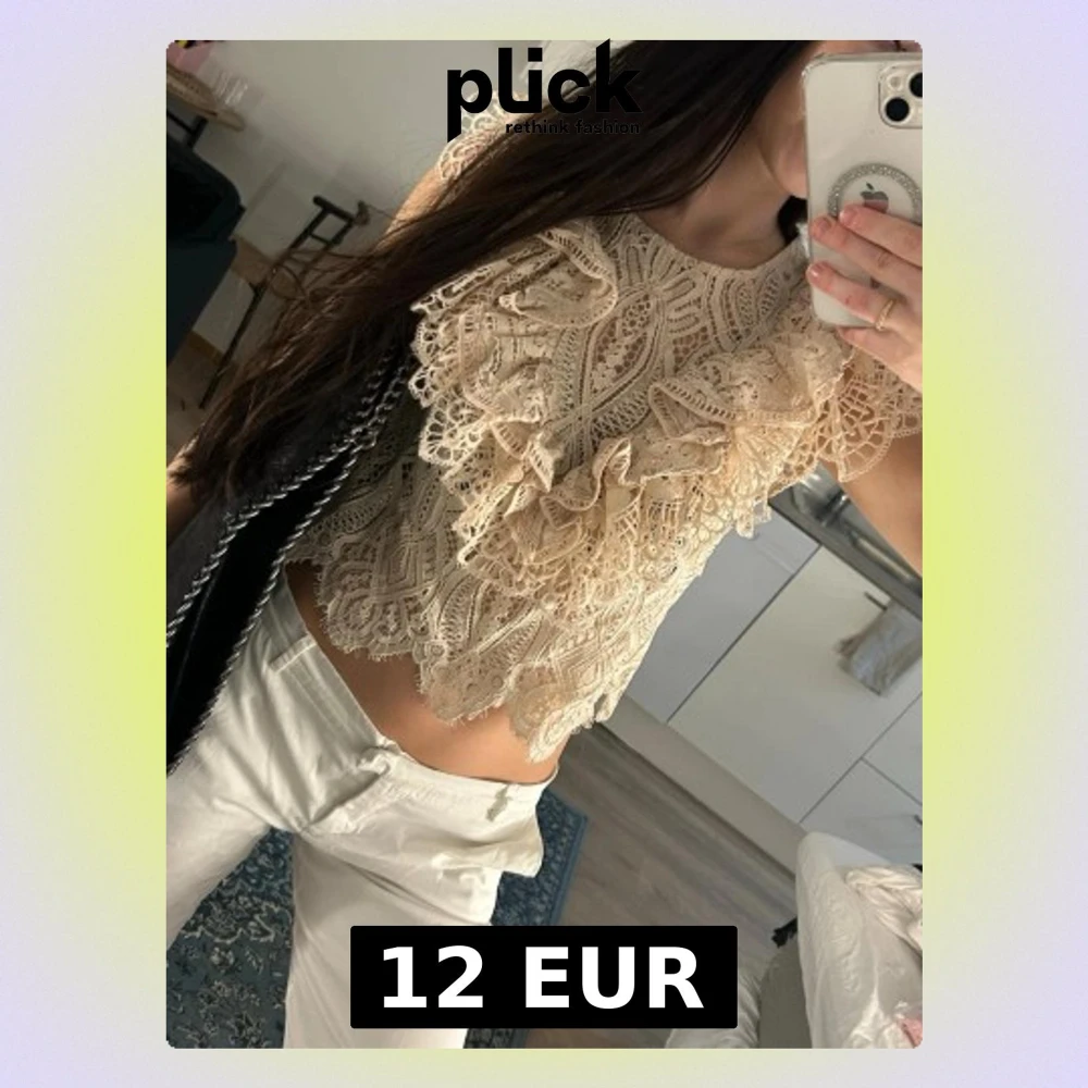 Supersöt beige blus i spets med volangdetaljer framtill. Croppad modell med korta ärmar och rund halsringning. Perfekt för dig som gillar romantisk och detaljerad stil. Spetsmönstret ger en lyxig känsla och toppen är lätt att matcha till både jeans och kjol.