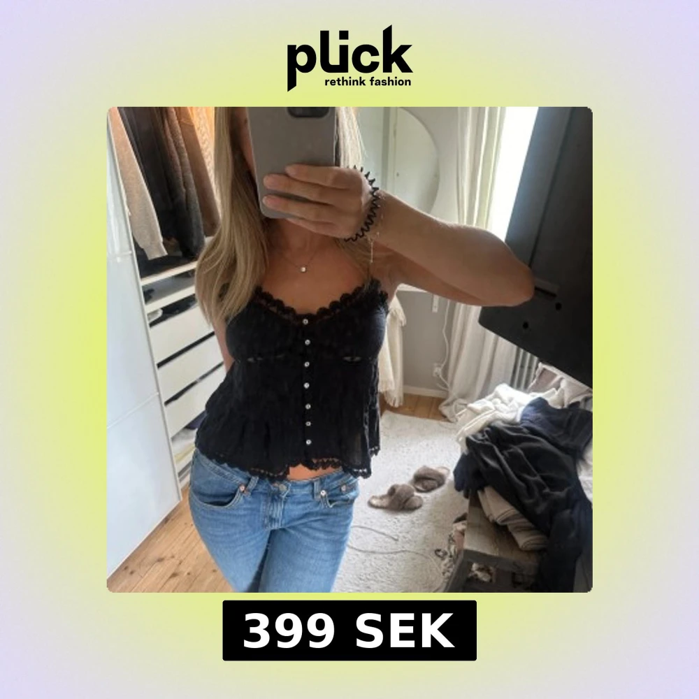 Supersöt svart linnetopp med spetskant och knappar framtill. Croppad modell med smala axelband och fina spetsdetaljer längs halsringningen och nederkanten. Perfekt att styla med jeans eller kjol för en trendig look.