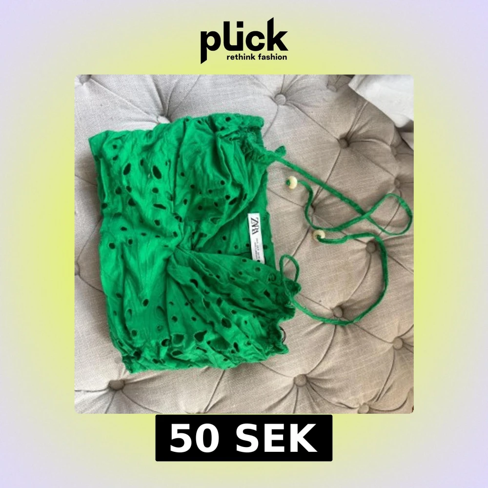 Snygg grön bandeau tubtopp från Zara med broderade hål och smockad baksida. Toppen har tunna knytband med pärldetaljer och är perfekt för en färgstark look. Lätt och luftig känsla, passar till sommarens alla outfits.