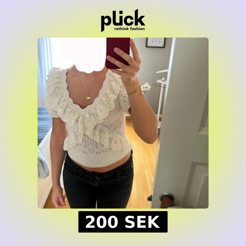 Supersöt vit blus från Zara med v-ringning, virkade detaljer och breda volanger i spets längs halsringningen och över bröstet. Säljer toppen i gott skick då jag inte funnit användning för den.