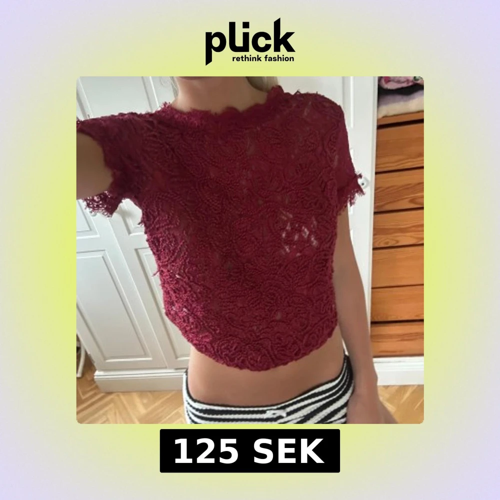 Supersnygg vinröd blus i spets med korta ärmar och croppad passform. Blusen har ett vackert blommigt spetsmönster och en synlig dragkedja bak.