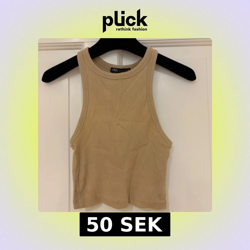 Snygg croppad linnetopp från Zara i beige ribbat material. Toppen är ärmlös med hög halsringning och har en clean, stilren look som passar perfekt till jeans eller kjol. Superenkel att matcha och riktigt trendig för sommaren!