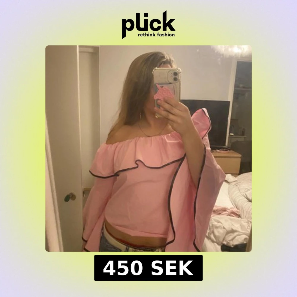 Säljer en söt rosa blus med bred volang och svarta kanter. Blusen har vida ärmar och en luftig passform som ger en trendig och lekfull look. Perfekt för dig som vill sticka ut med en färgglad och unik topp.