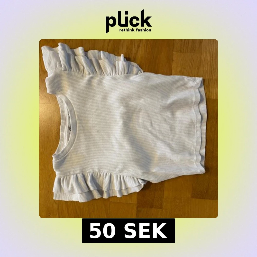 Supersöt vit ribbad topp från Zara med volangdetaljer på axlarna. Perfekt för dig som vill ha något enkelt men ändå med en twist. Rund halsringning och korta ärmar med volang. Liten defekt (se bild) men syns knappast.