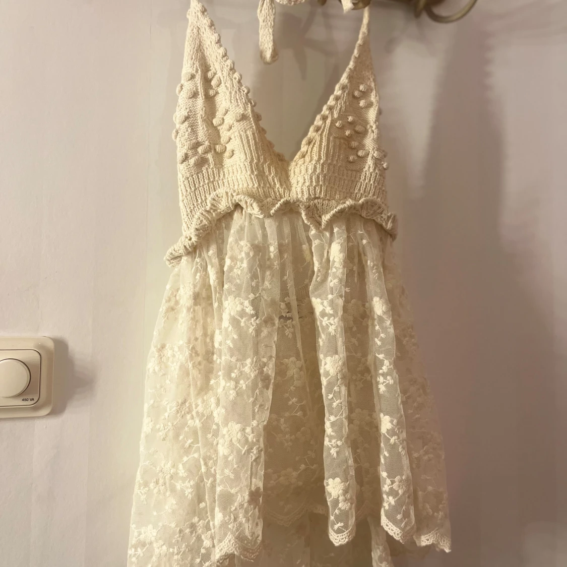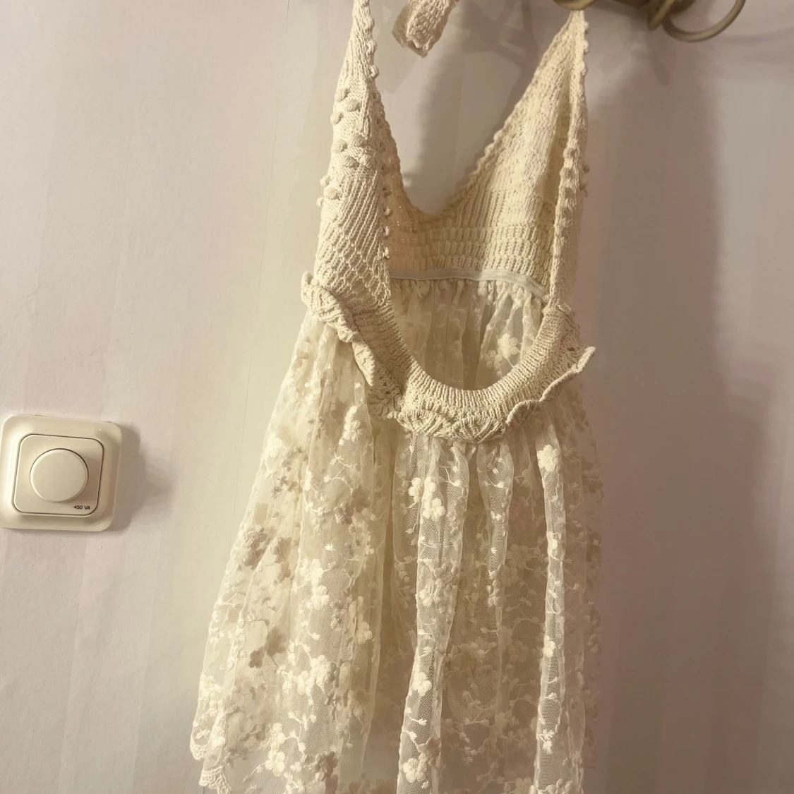 Charmig vit klänning med en stickad topp och spetskjol. Den har en v-ringad design med dekorativa detaljer på toppen och en öppen rygg. Perfekt för sommarens varma dagar. Hör av er vid intresse