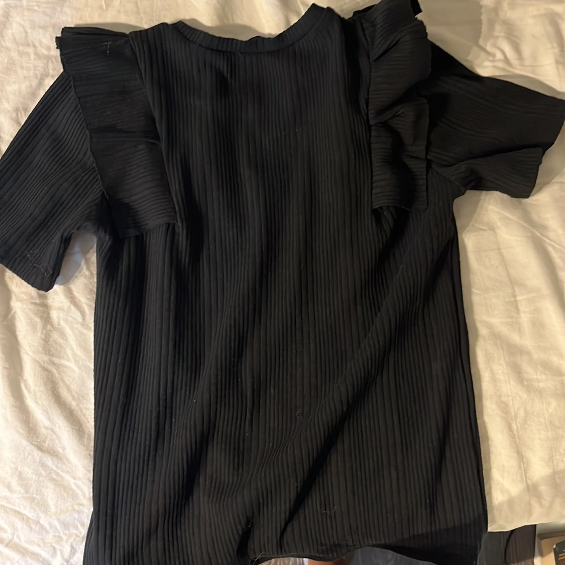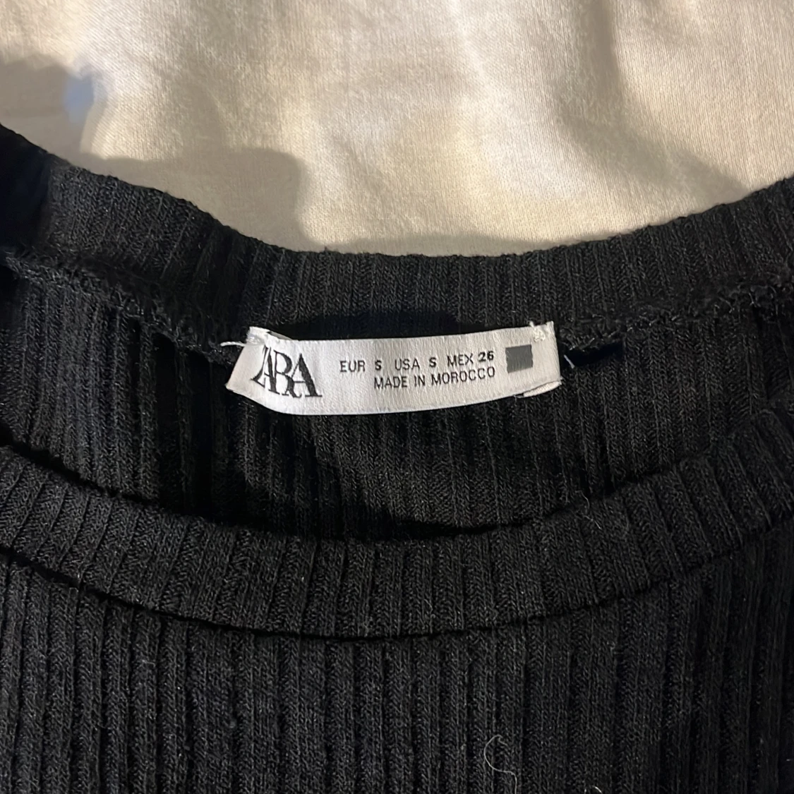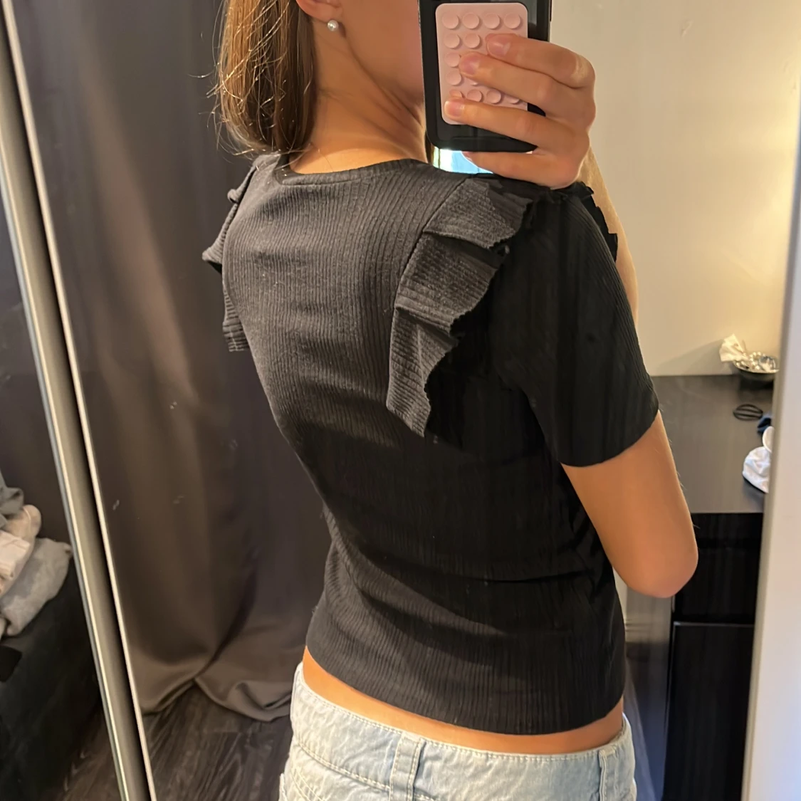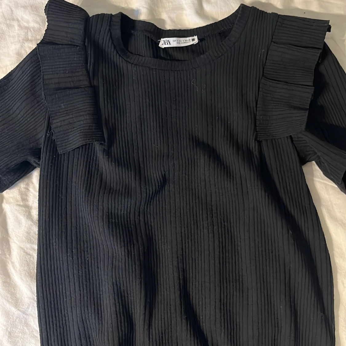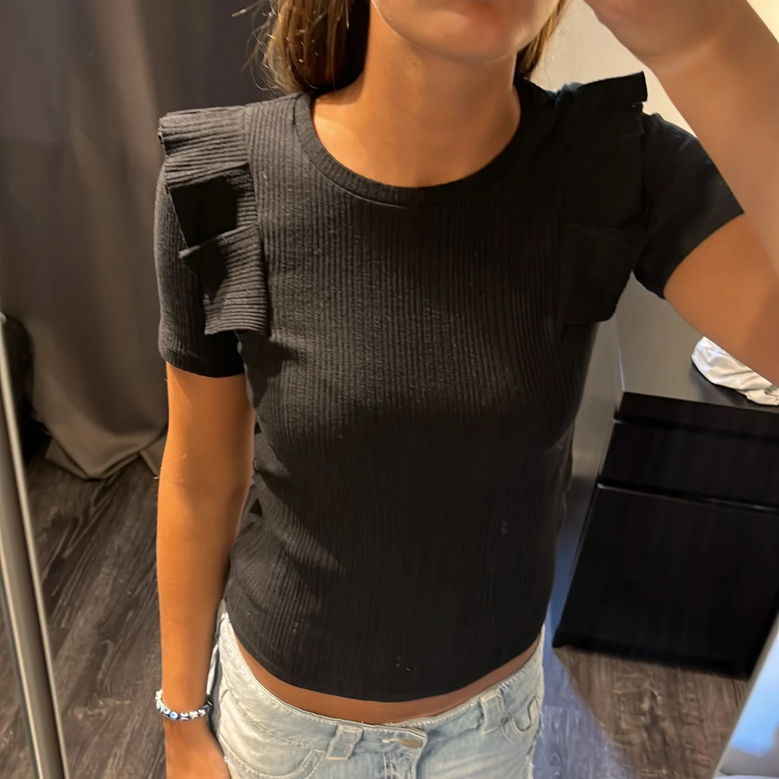 Svart ribbad topp från Zara med korta ärmar och snygga volangdetaljer på axlarna. Toppen har rund halsringning och är figurnära i modellen. Perfekt för dig som vill ha en enkel men ändå trendig look.