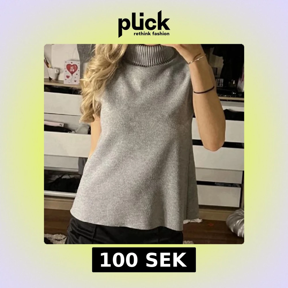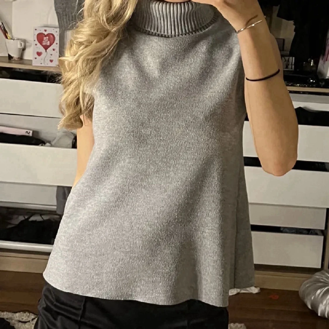 Säljer en stilren grå polotopp med bred, ribbad polokrage. Toppen är ärmlös och har en loose passform som ger en chill vibe. Materialet är mjukt och stickat, perfekt för lager på lager.