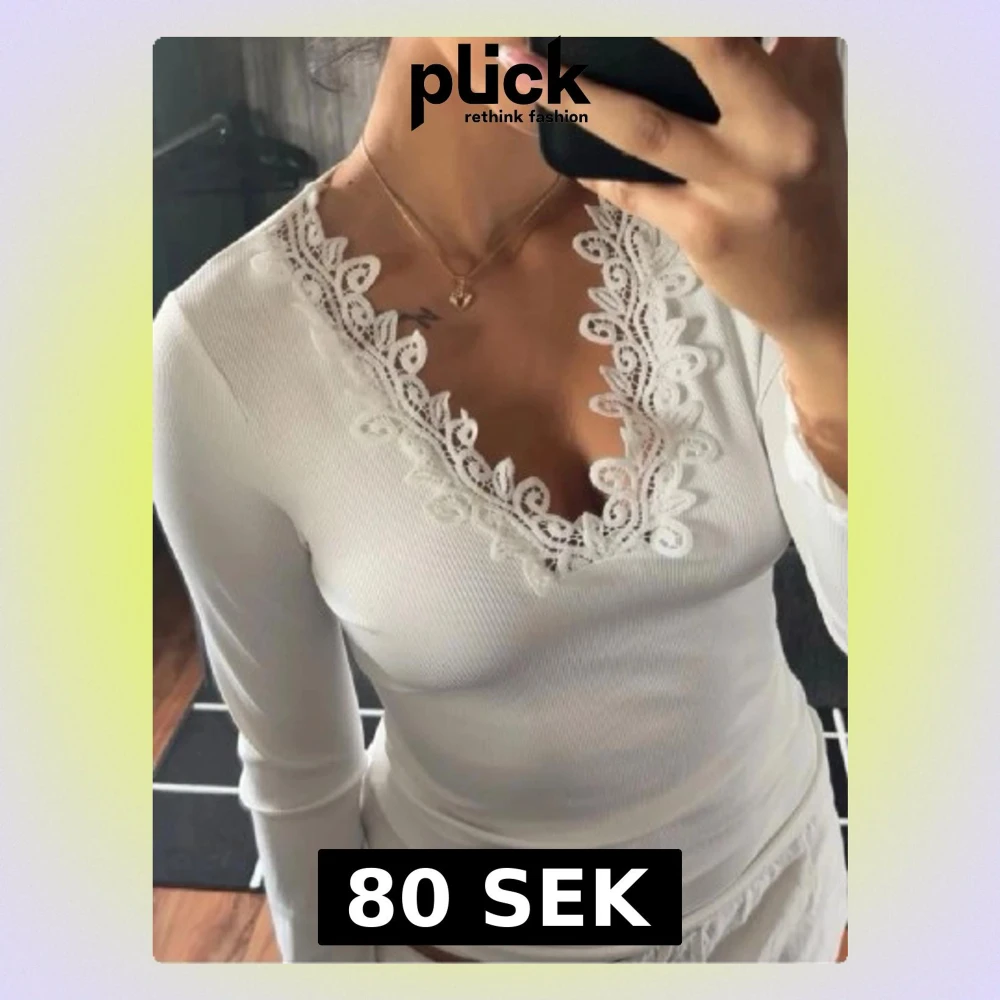 Säljer en vit långärmad topp med v-ringning och fina spetsdetaljer runt halsringningen och ärmsluten. Den har tyvärr aldrig kommit till användning😊