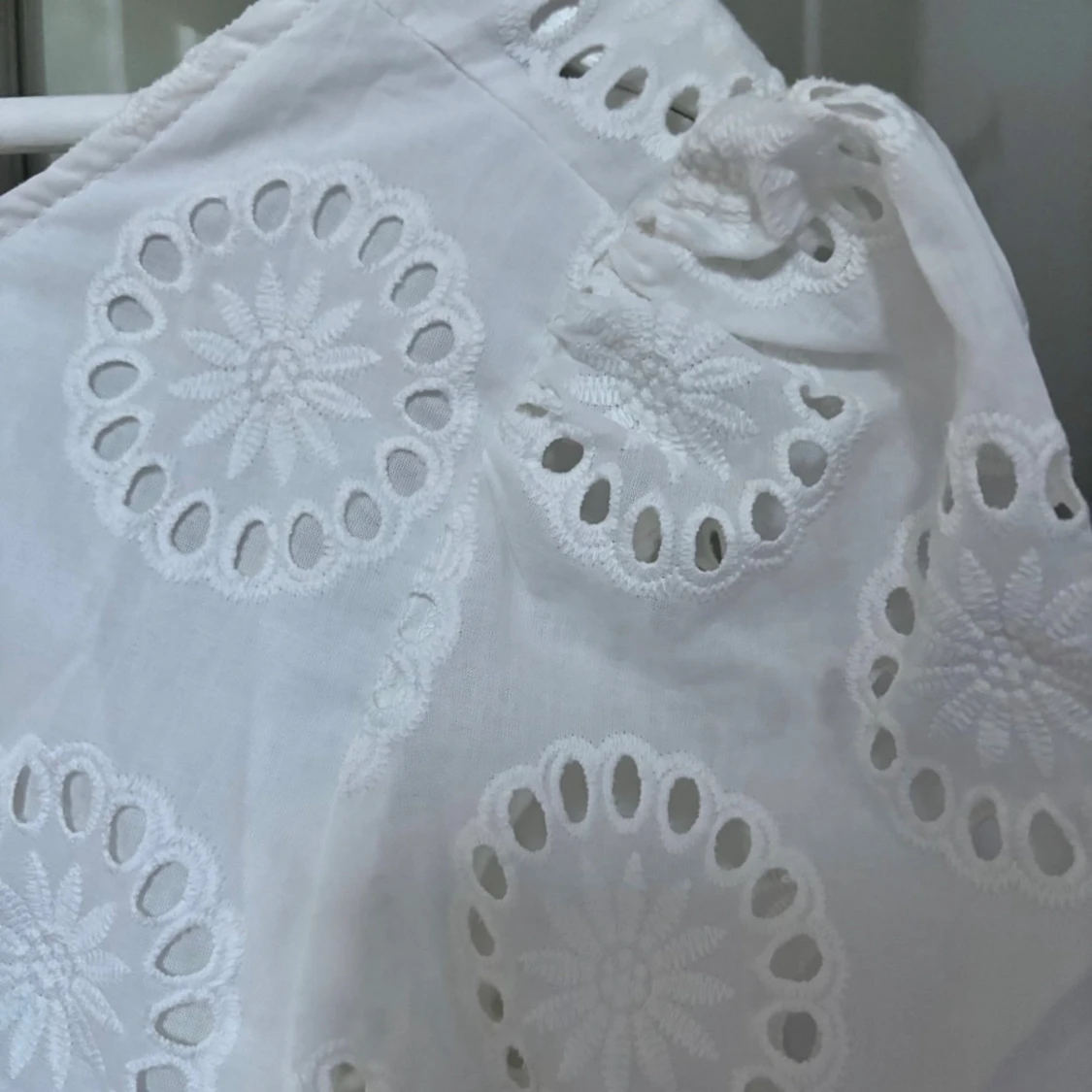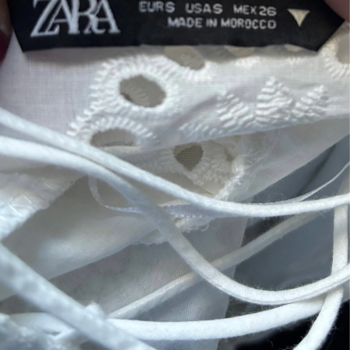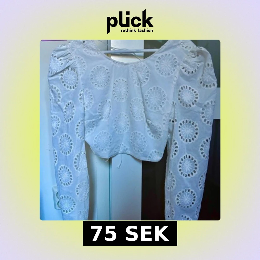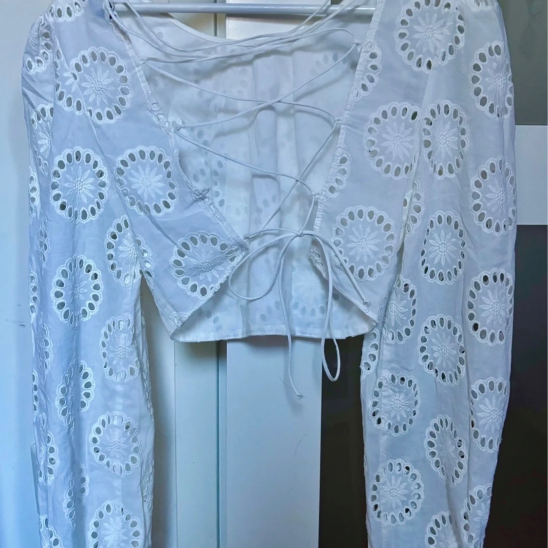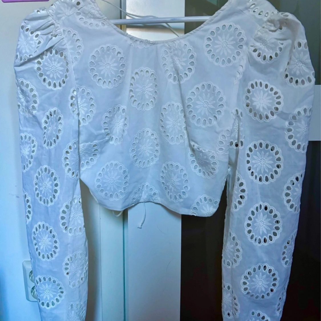 Superfin vit blus från Zara med broderade cirkelmönster och långa puffärmar. Toppen är croppad och har snygg snörning i ryggen som ger en unik look. Tillverkad i bomull och perfekt för vår och sommar. Säljer då den inte kommer till användning längre!
