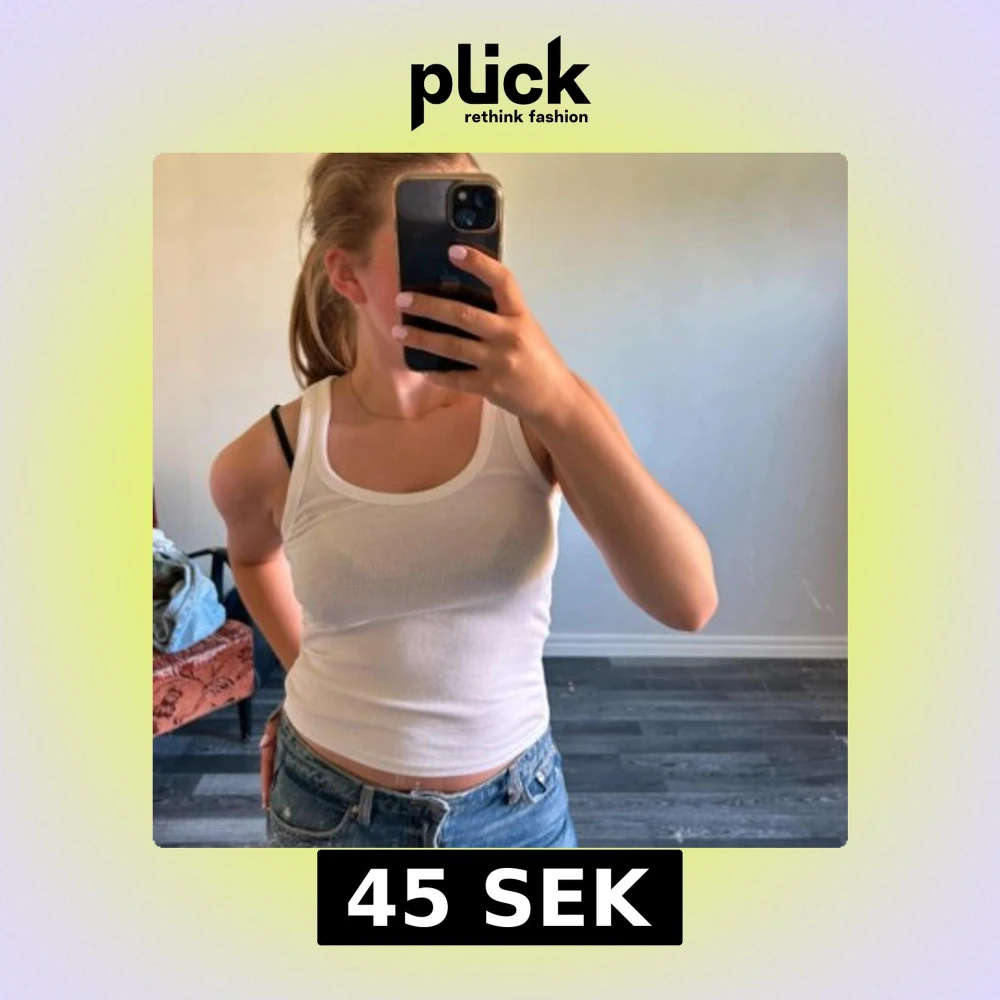 Säljer en vit ribbad linnetopp med rundad hals och breda axelband. Toppen är croppad och sitter tight mot kroppen, perfekt till jeans eller shorts. Materialet är mjukt och stretchigt, troligen bomull eller en bomullsblandning.