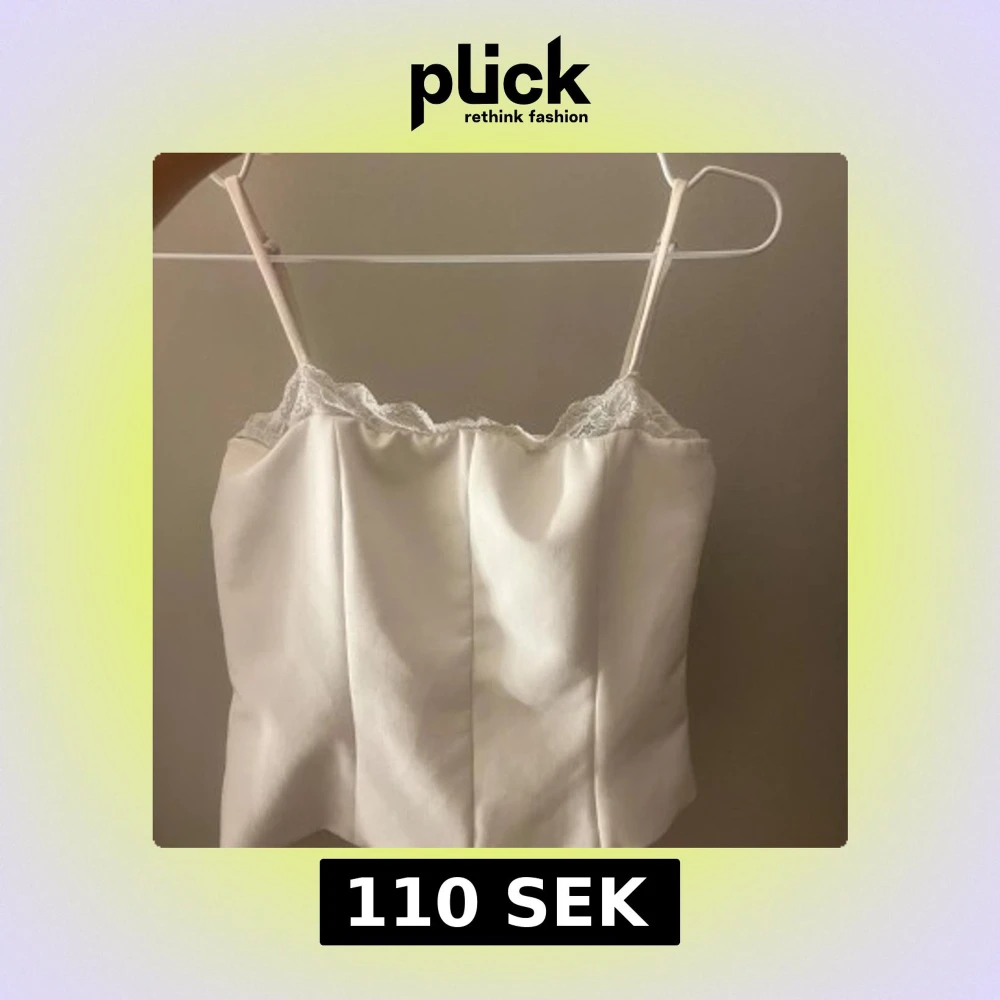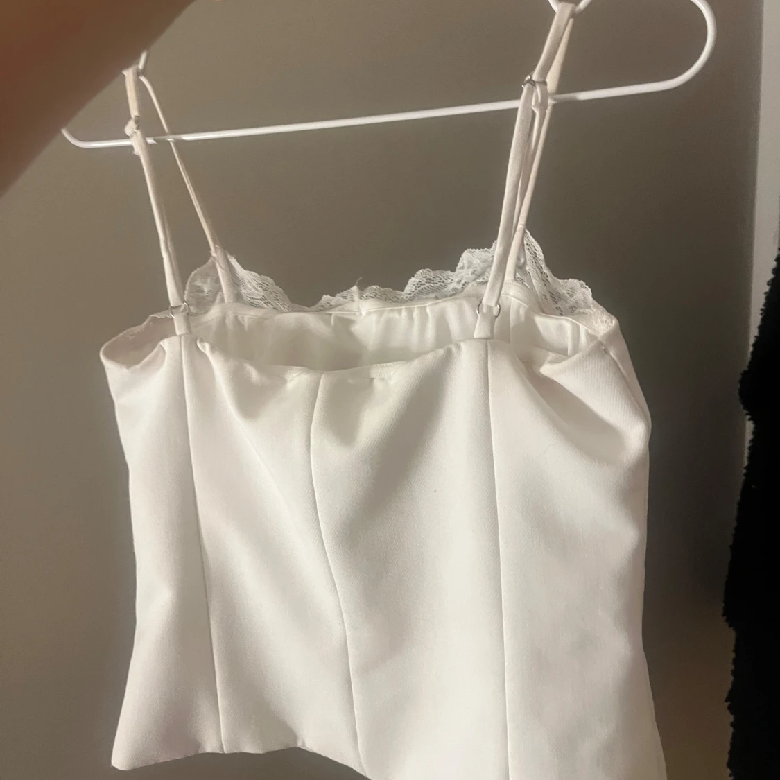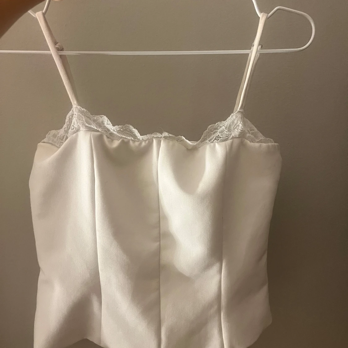 Säljer en stilren vit korsett-topp med tunna axelband och vacker spets längs urringningen. Toppen har en lätt strukturerad form och är perfekt för dig som vill ha en chic och feminin look. Materialet känns mjukt och har en lätt glans.