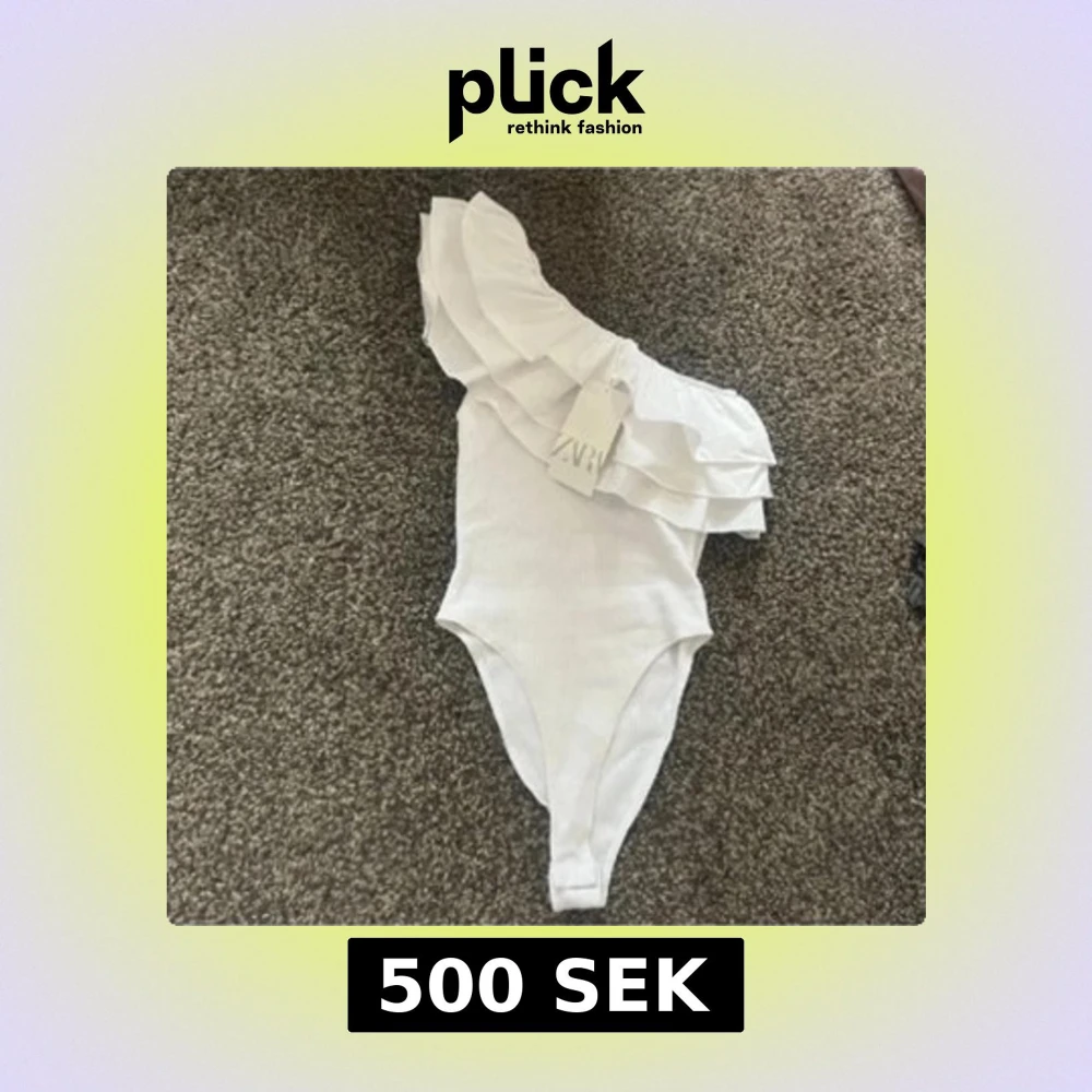 Säljer en stilren vit oneshoulder topp från Zara med volangdetaljer. Perfekt för en trendig look. Toppen är ärmlös och har en elegant passform. Säljer då den är för liten. Bara använd två gånger!