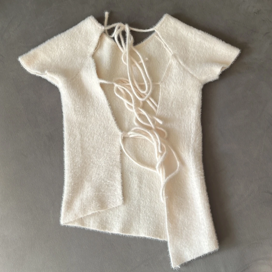 Superfin vit stickad topp från Zara med korta ärmar och omlottdesign. Toppen har snörning i ryggen som ger en snygg detalj och lite edge. Mjuk och fluffig känsla, perfekt till jeans eller kjol. Asymmetrisk nederkant för extra stilpoäng.