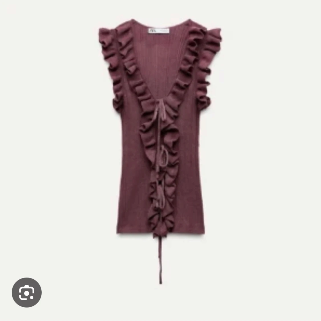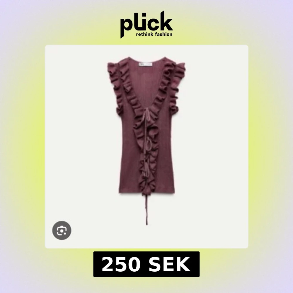 Supersnygg vinröd topp från Zara med djup v-ringning och volanger längs halsen och axlarna. Toppen har en ribbad struktur och knyt framtill för extra detalj.