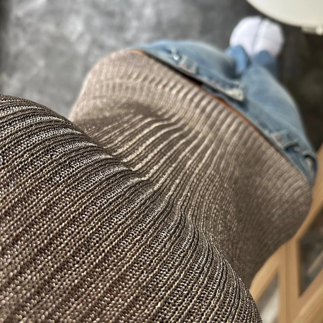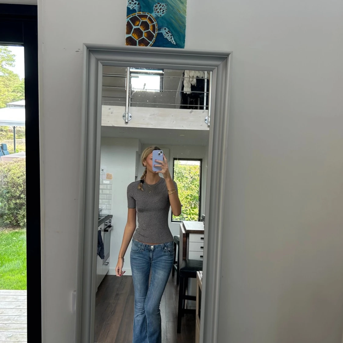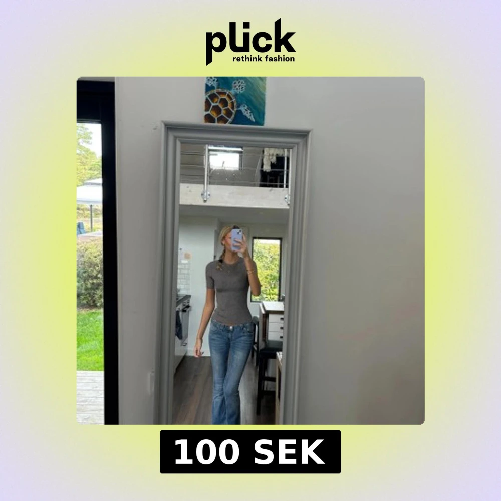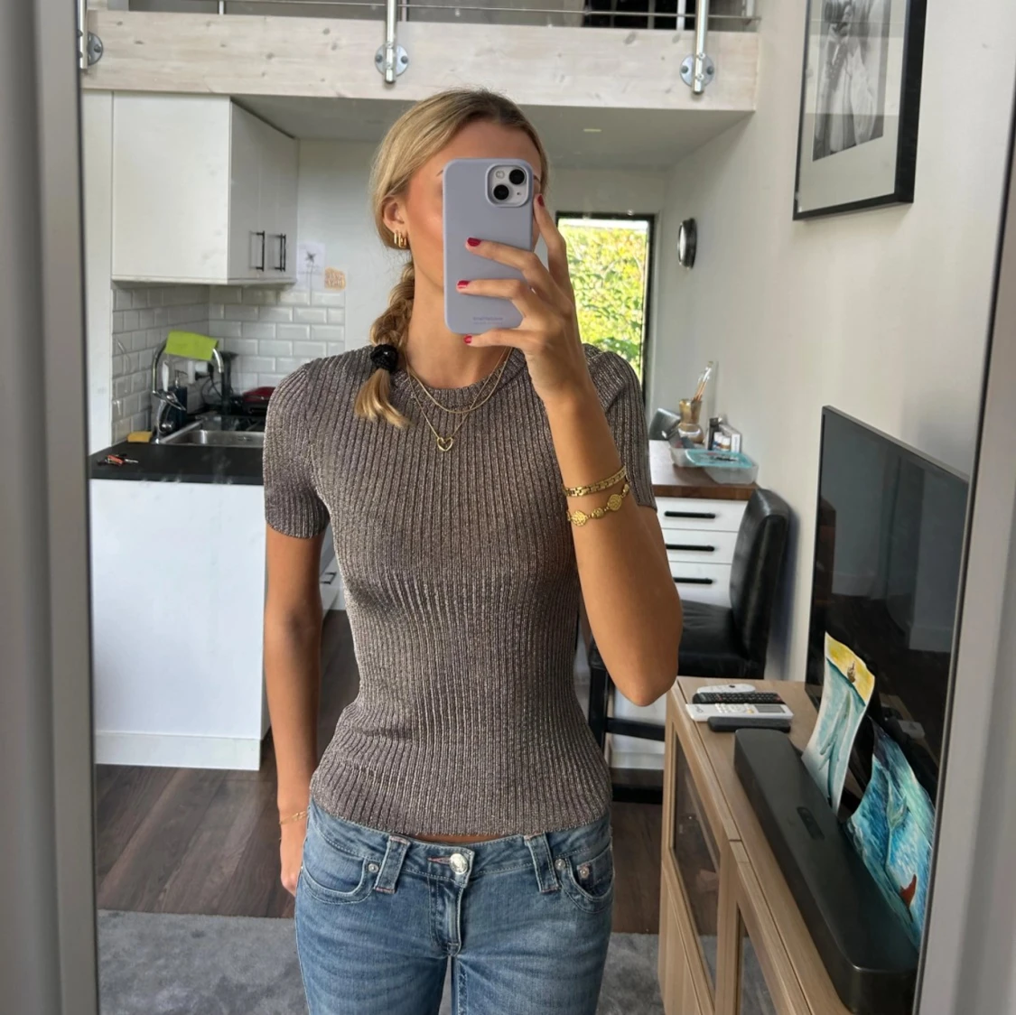 Säljer en ribbad grå topp med korta ärmar och rund hals. Toppen är slim fit och har en snygg, figurnära passform. Materialet är stickat och har en lätt glansig finish som ger en cool och glittrig vibe. Perfekt att styla med jeans eller kjol för en trendig look.