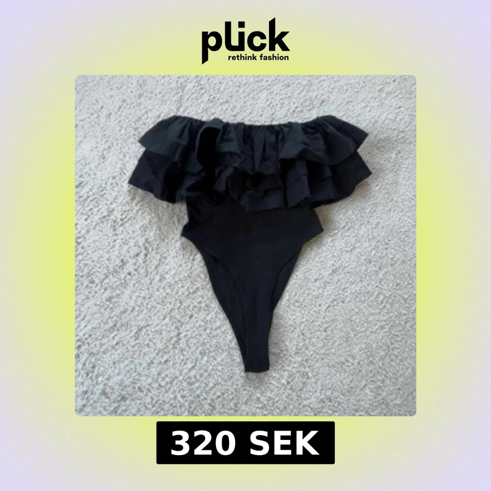 Supersnygg svart body från Zara med bred volang upptill som ger en trendig och cool look. Perfekt för när du vill sticka ut lite extra. Modellen är axelbandslös och har en hög benskärning.