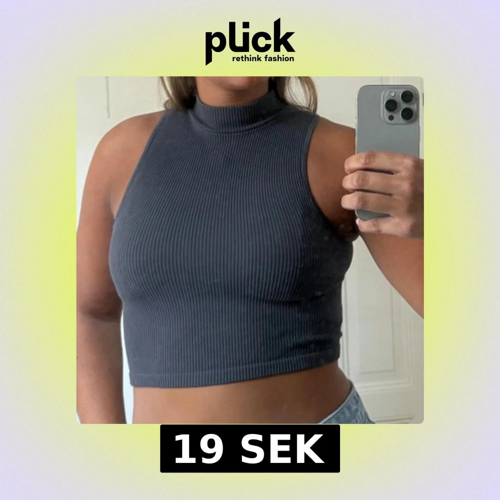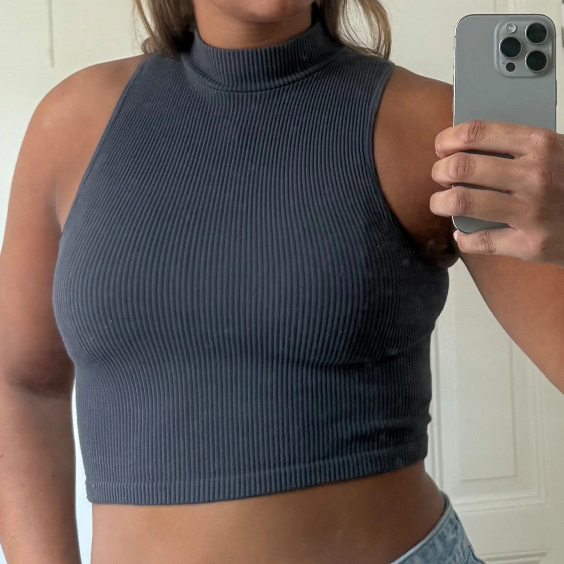 Snygg mörkgrå croppad turtleneck med ribbad struktur från Zara. Ärmlös modell med hög hals som ger en clean och modern look.