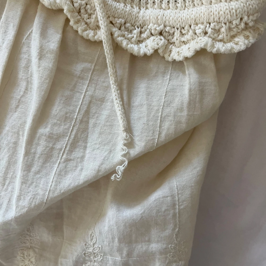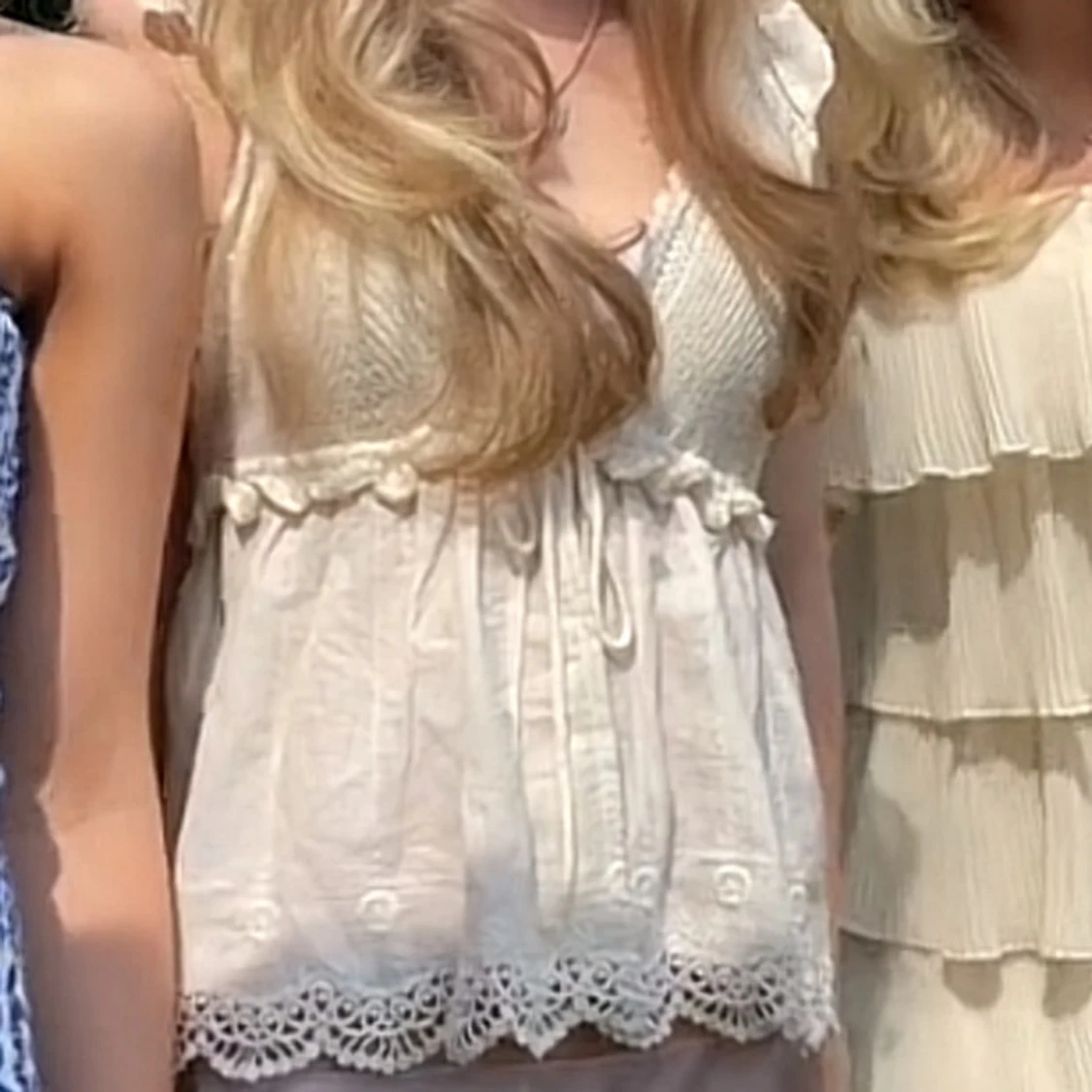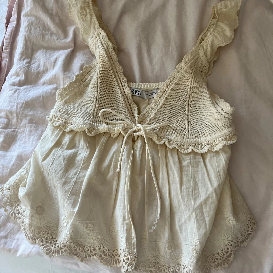 Säljer en söt vit topp från Zara med spetsdetaljer och knytband framtill. Toppen har en vacker virkad överdel och ärmlös design, perfekt för sommardagar. Den har en luftig passform och fina broderade kanter. Trådet har gått upp lite på snöret men inget som syns när den är på (sista bilden).