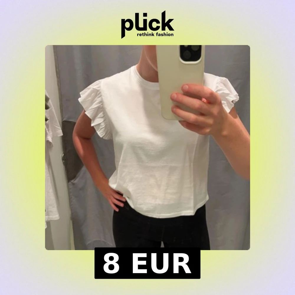 Säljer en söt vit blus med korta volangärmar. Toppen har en rund halsringning och är tillverkad i mjuk bomull. Perfekt för dig som gillar en clean och fräsch look med lite extra detaljer på axlarna.