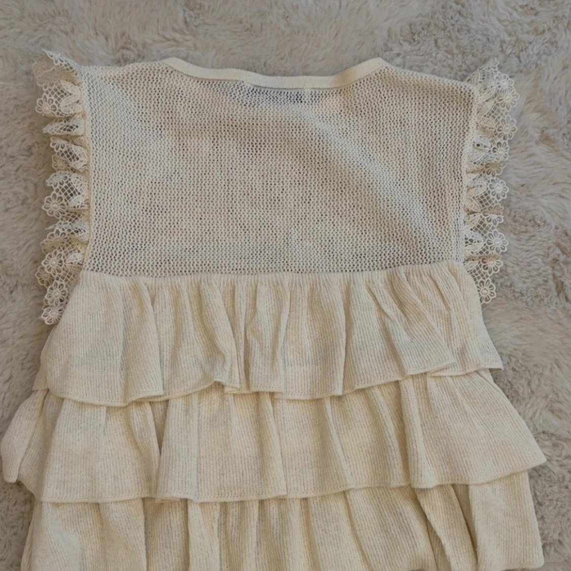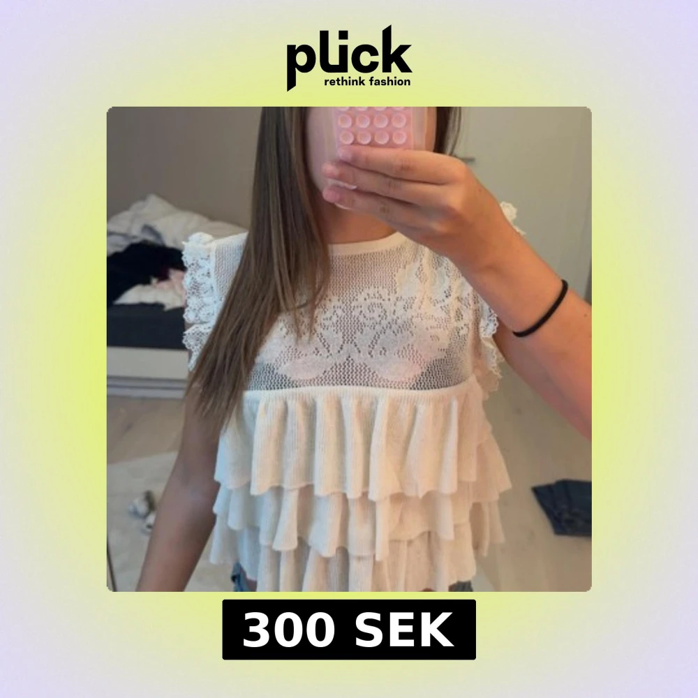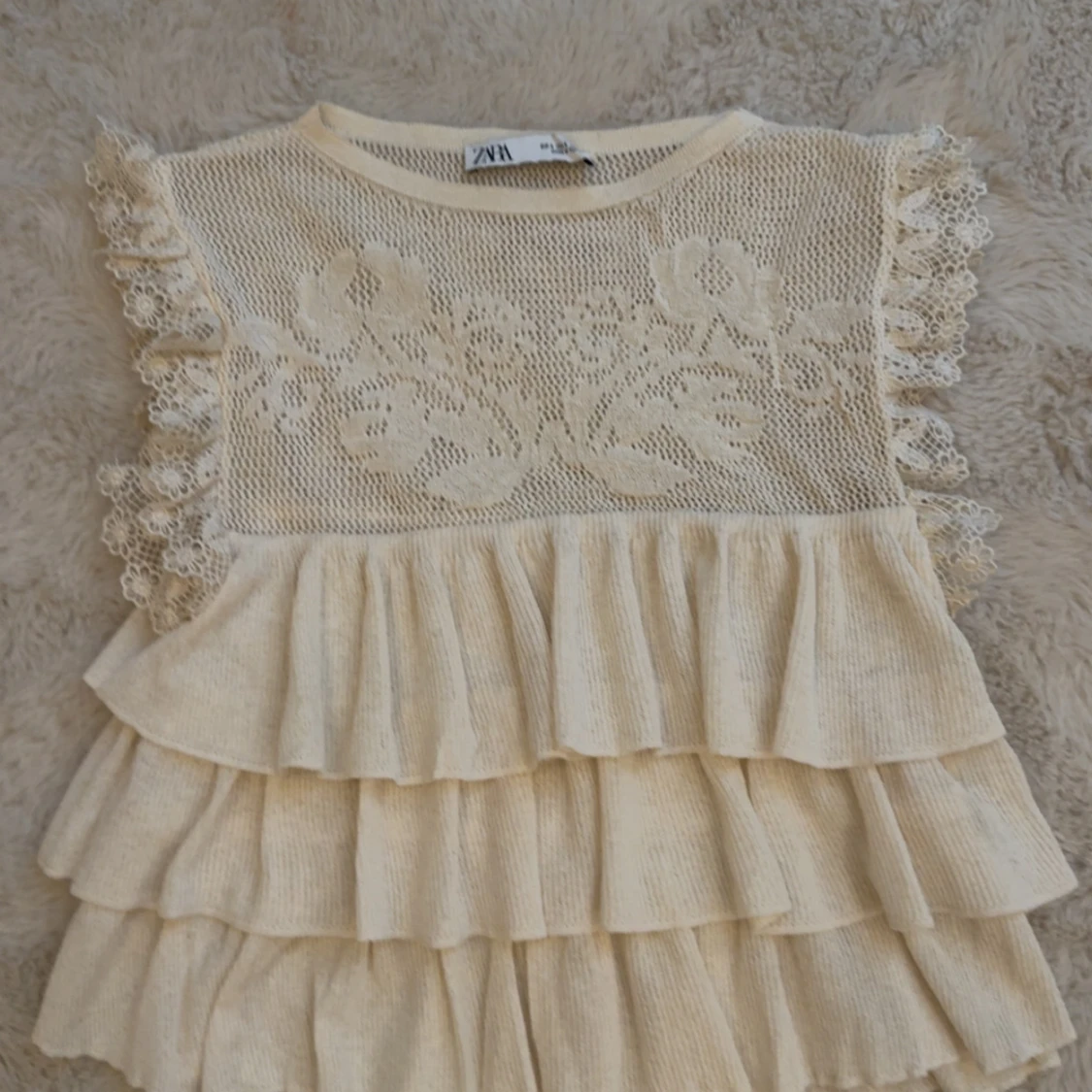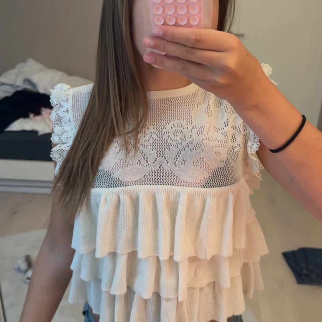Supersöt vit blus från Zara med flera lager volanger och detaljerad spets upptill. Ärmlös modell med spetskantade axlar och blommigt mönster i spetsen. Älskar denna men den kommer inte till användning längre tyvärr!! Verkligen super söt. Köpte för 399kr