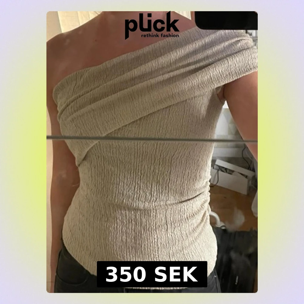 Säljer en beige offshoulder topp med snygg omlott-effekt och skrynklig struktur. Toppen har en asymmetrisk design med en axel bar och är tillverkad i ett mjukt, syntetiskt material.💕