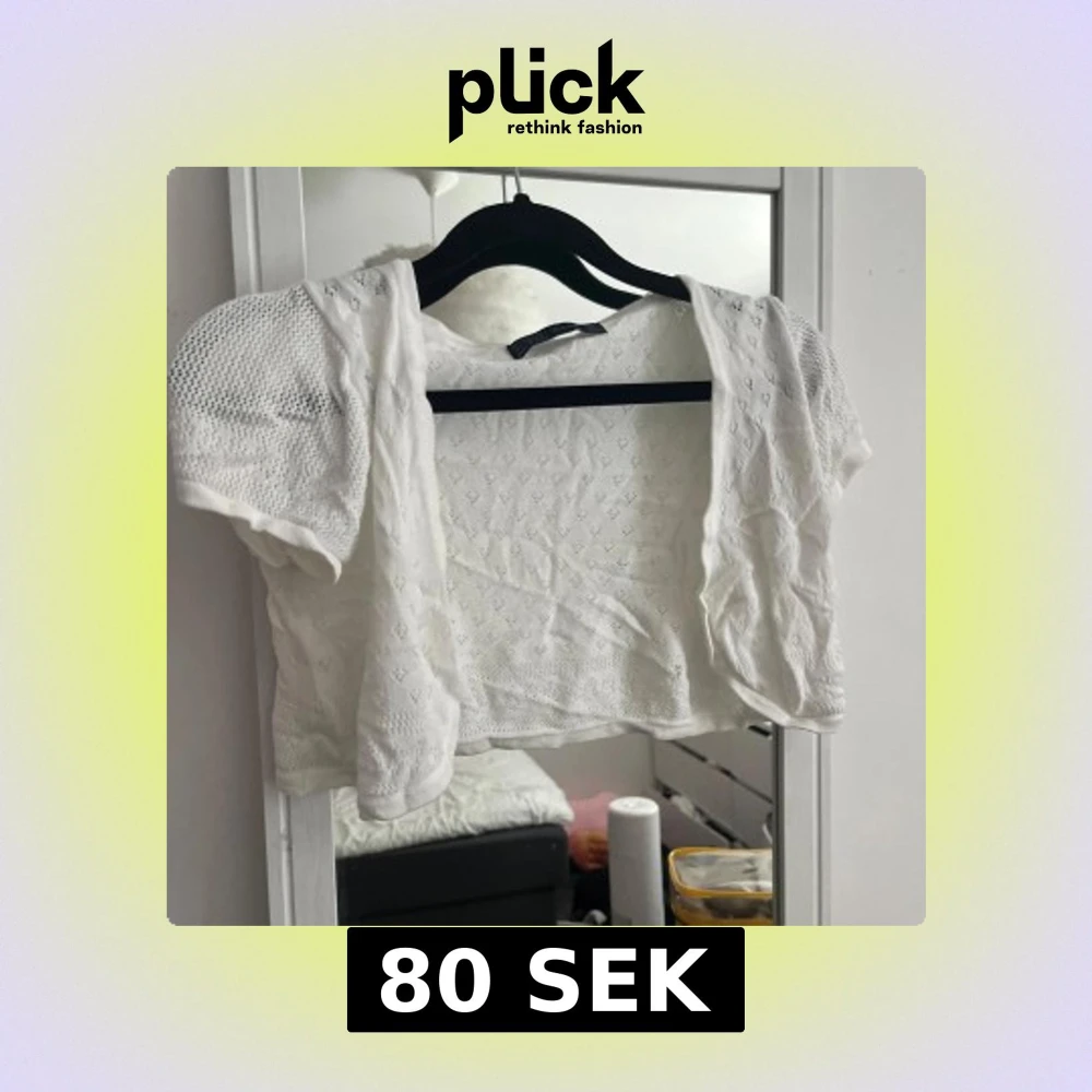 Söt vit bolerokofta med korta ärmar och spetsmönster över hela tyget. Toppen är croppad och har en luftig, stickad känsla med små hålmönster som ger en extra touch. Perfekt att slänga över en klänning eller linne för en chill och trendig look.