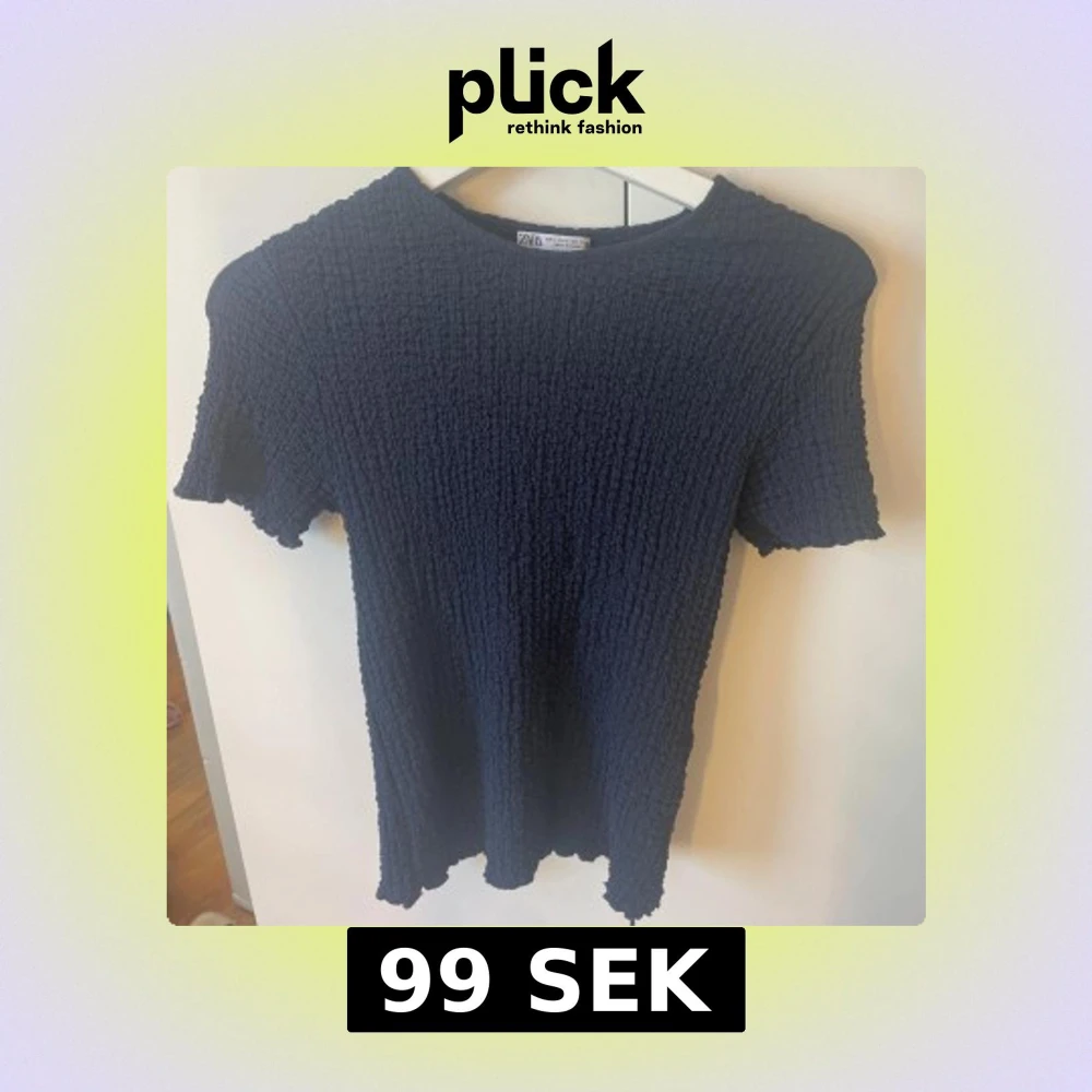 En mörkblå topp från Zara med korta ärmar och rund hals. Tyget är ribbat och har en cool, skrynklig struktur som ger en unik look. Perfekt att styla med jeans eller kjol för en chill vibe.