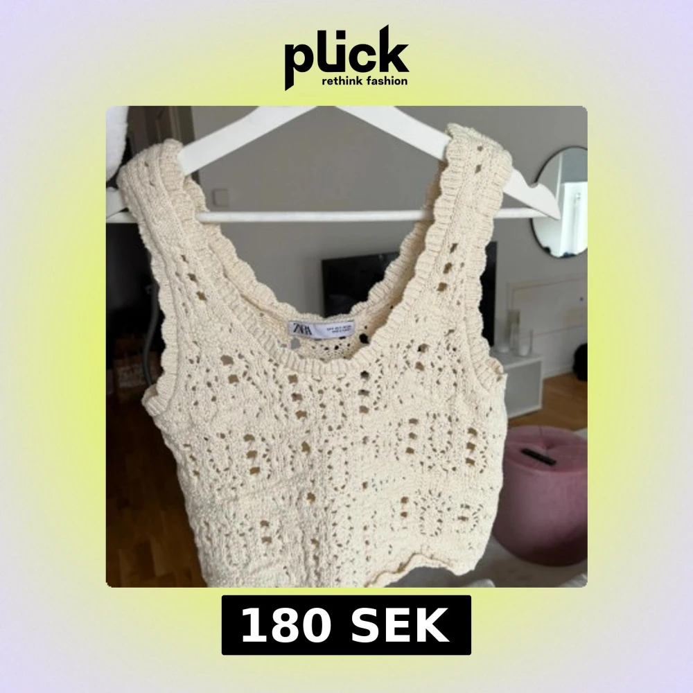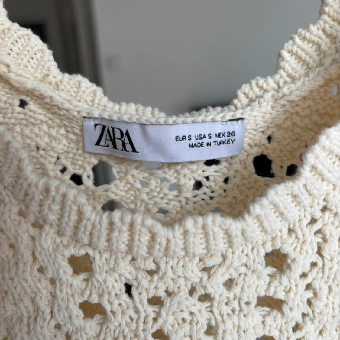 Superfin beige virkad linnetopp från Zara med breda axelband och snyggt hålmönster. Toppen är croppad och har en bohemisk känsla, perfekt till jeans eller kjol. Materialet är mjukt och luftigt, vilket gör den skön att bära under varma dagar.