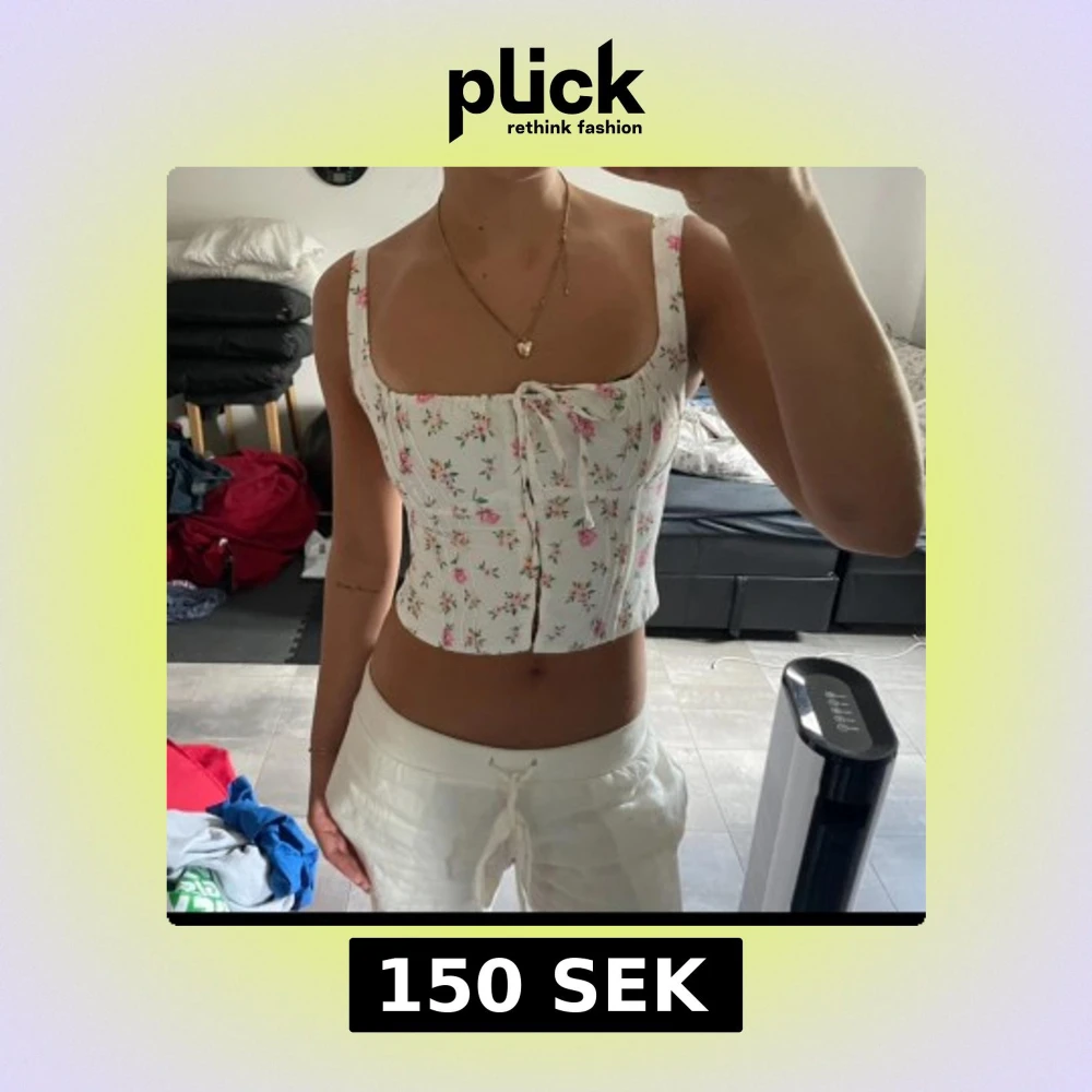 Säljer en söt blommig korsettopp med knytning framtill. Toppen är vit med rosa och gröna blommor och har en croppad passform. Perfwkr nu till sommar, köp via köp nu❤️