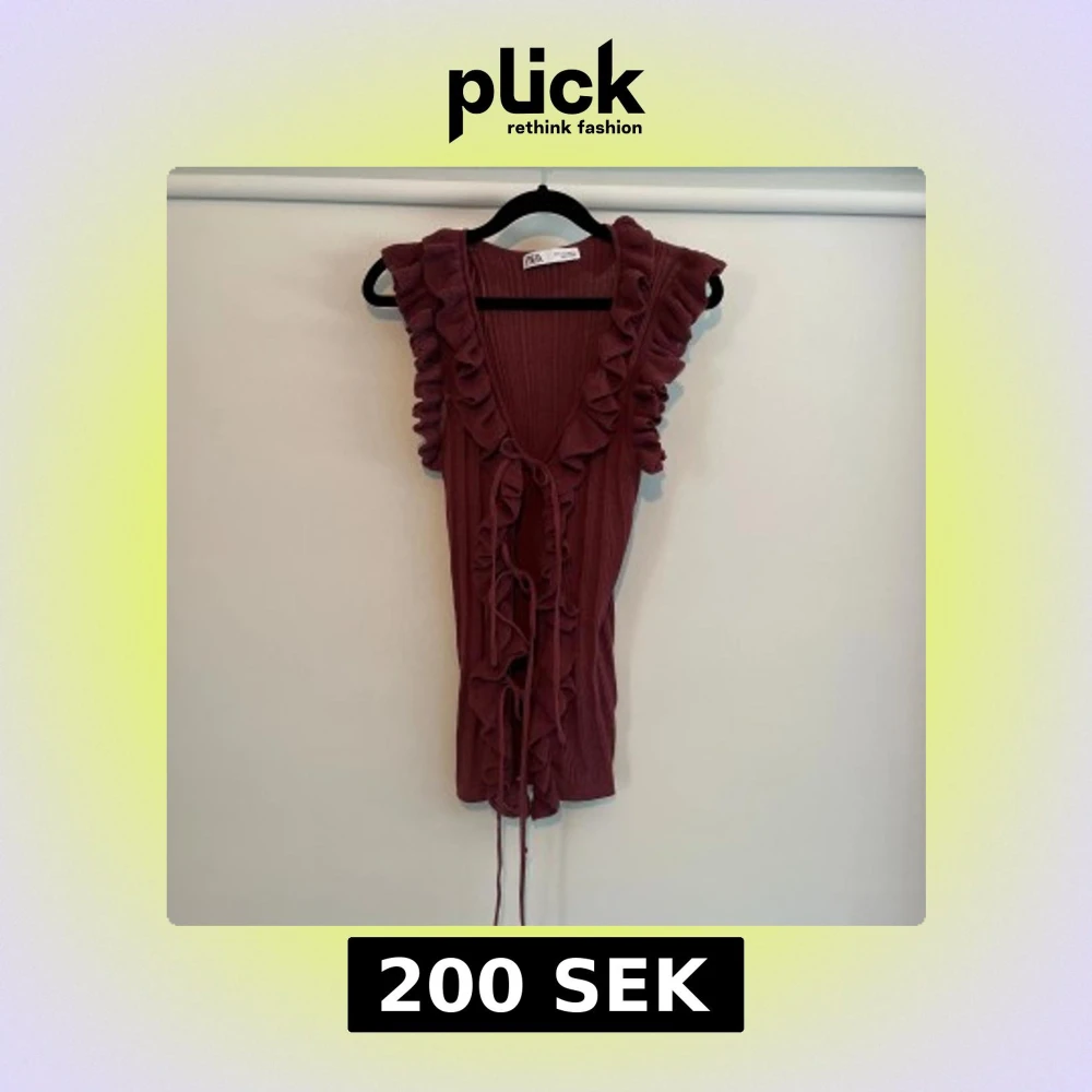 Supersöt vinröd ribbad topp från Zara med volangdetaljer längs axlar och urringning. Toppen är ärmlös och har knytband framtill.