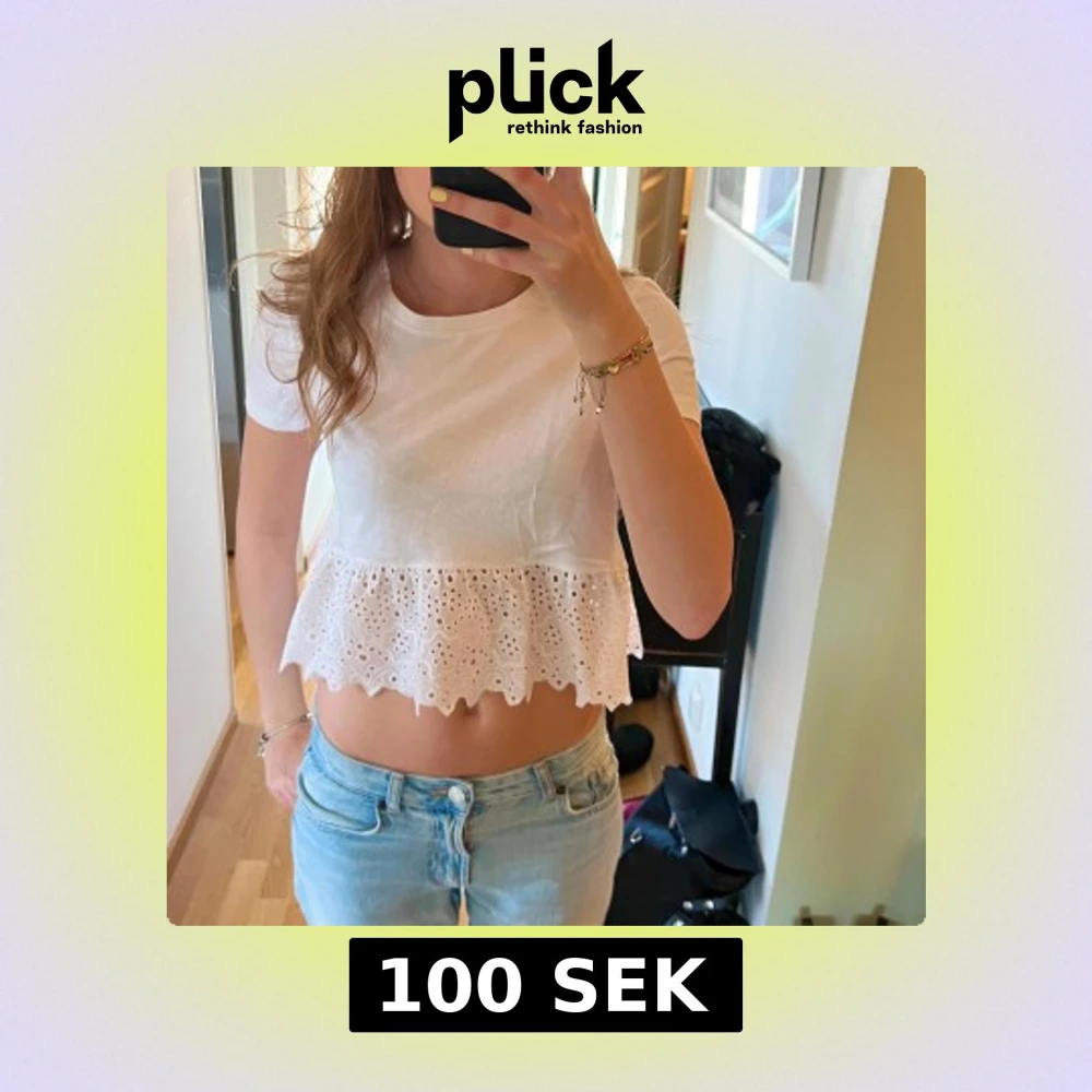 Säljer en söt vit topp med korta ärmar och en fin spetsvolang nedtill. Perfekt för sommardagar och ger en romantisk touch till din outfit. Toppen är croppad och har en normal passform.