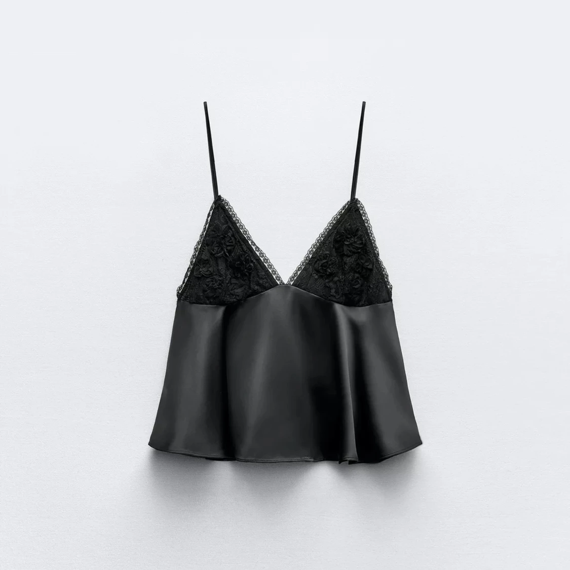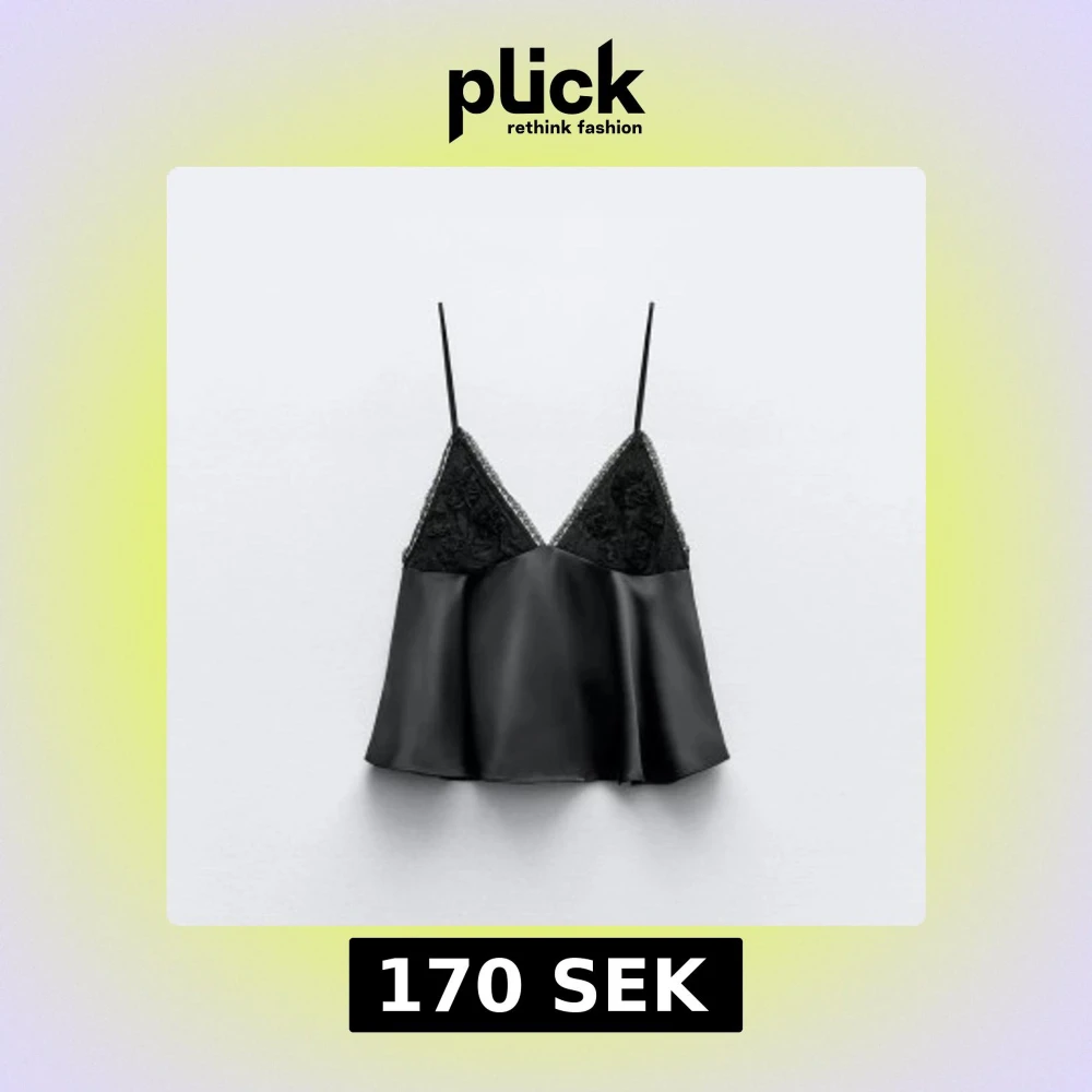 Supersnygg svart linnetopp i satin med tunna axelband och v-ringning. Överdelen har fina spetsdetaljer och blommiga broderier. Banden går att justera längd på. Inga defekter på.