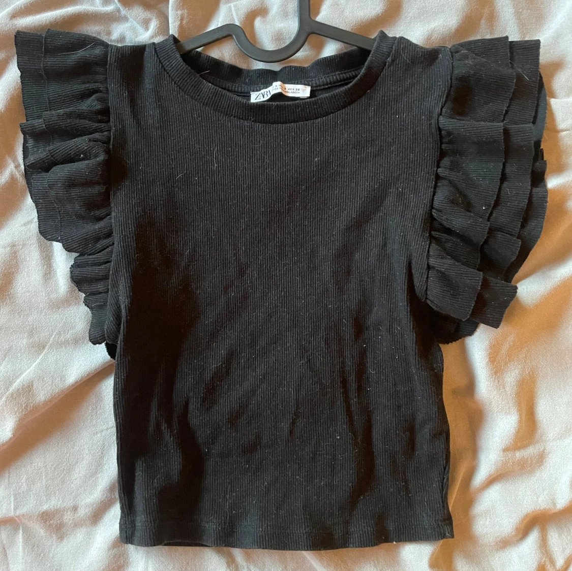 Supersöt svart ribbad topp med volangärmar från Zara! Använd någon gång men väldigt bra skick, passar perfekt nu när våren är påväg🥰