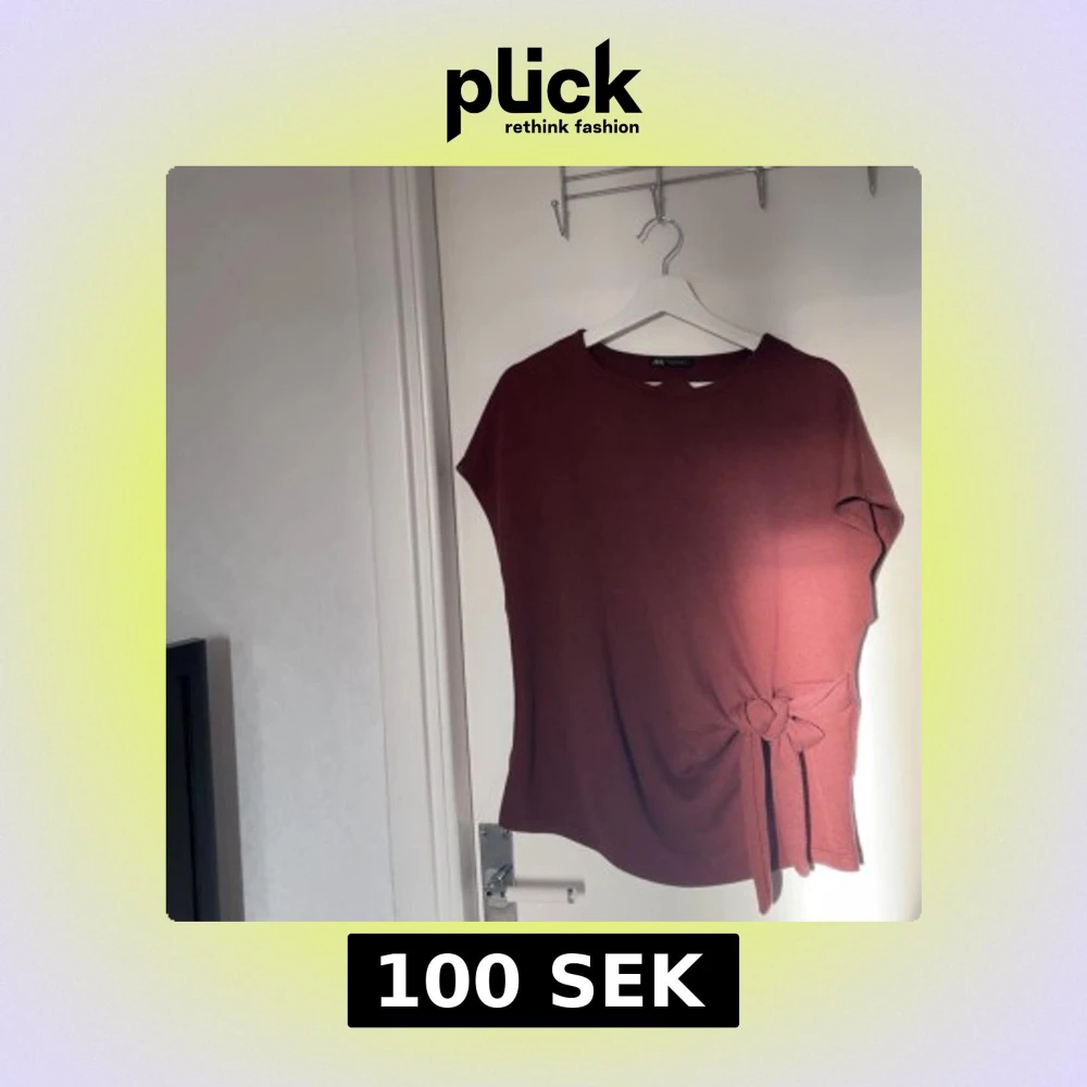 Säljer en vinröd topp från Zara med rund hals och korta ärmar. Toppen har en snygg knyt-detalj på sidan som ger en cool touch. Materialet känns mjukt och skönt, perfekt för att lyfta din outfit med lite färg.