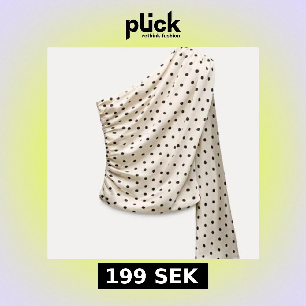 Snygg oneshoulder-topp i beige med svarta prickar. Toppen har en draperad design och en dragkedja i sidan för enkel på- och avtagning. Perfekt för en trendig look. Helt ny enbart provad, intakt prislapp. Liten i storleken snarare M/L beroende på byst.