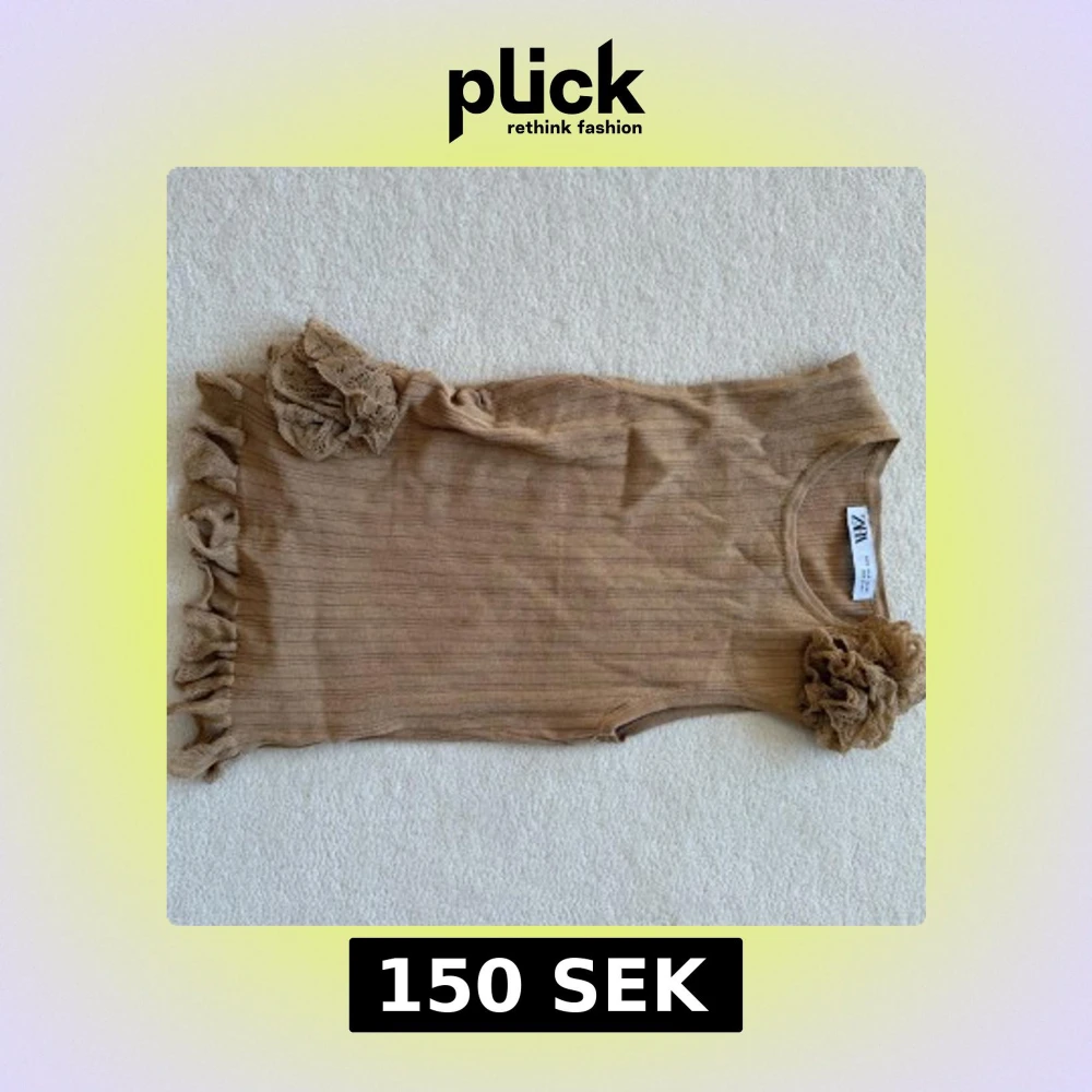 Supersöt beige kortklänning från Zara med ribbad struktur och volangdetaljer i spets vid axel och nederkant. Ärmlös modell som ger en chill och trendig vibe, perfekt för dig som gillar att sticka ut med detaljer. Passar dig som vill ha något unikt och stilrent.