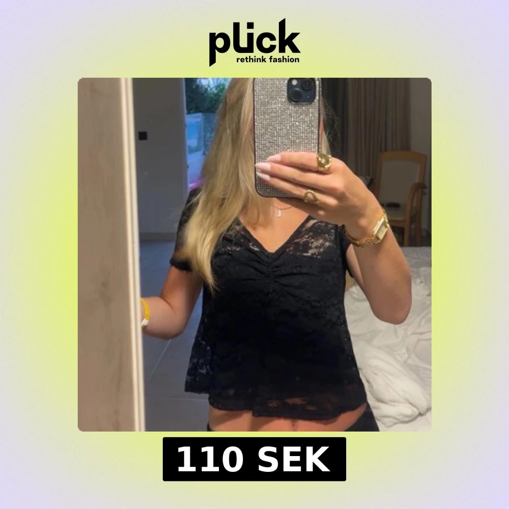 Säljer en svart blus i spets med v-ringning och korta ärmar. Toppen har en lätt croppad passform och fina rynkdetaljer framtill. Perfekt för dig som gillar en feminin och trendig look.
