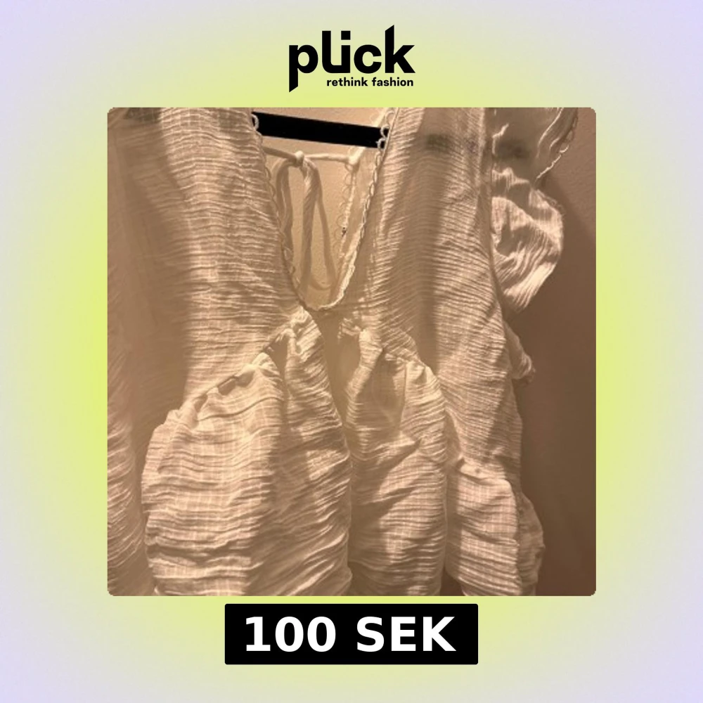 Säljer en söt vit blus med volanger och djup v-ringning. Blusen har knytning i ryggen och är tillverkad i ett lätt, krinklat tyg. Perfekt för varma dagar och ger en romantisk känsla till outfiten.