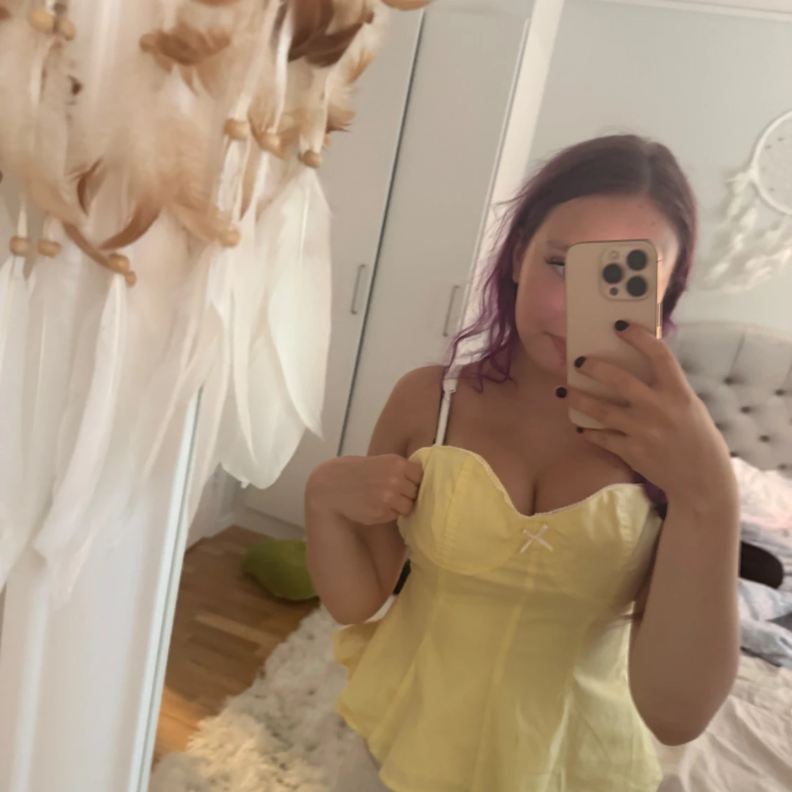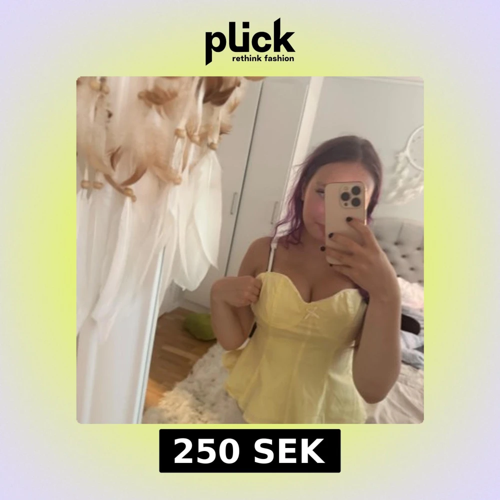 Söt gul korsett-topp med liten vit rosett framtill och volangig nederkant. Axelbandslös design med markerad byst och lätt utsvängd passform. Perfekt för dig som vill sticka ut med en färgglad och feminin look.