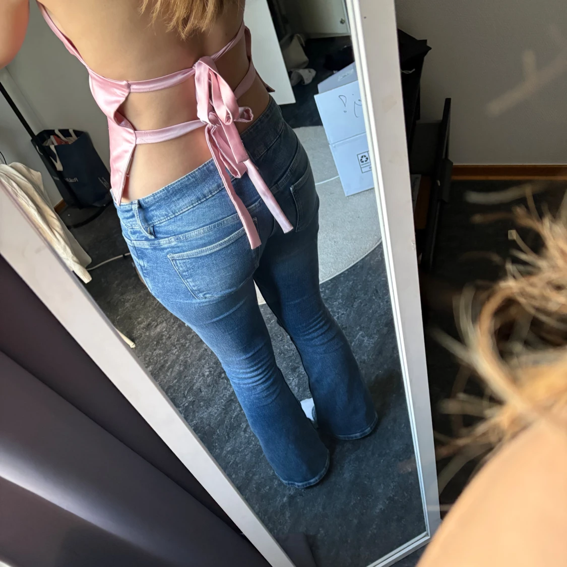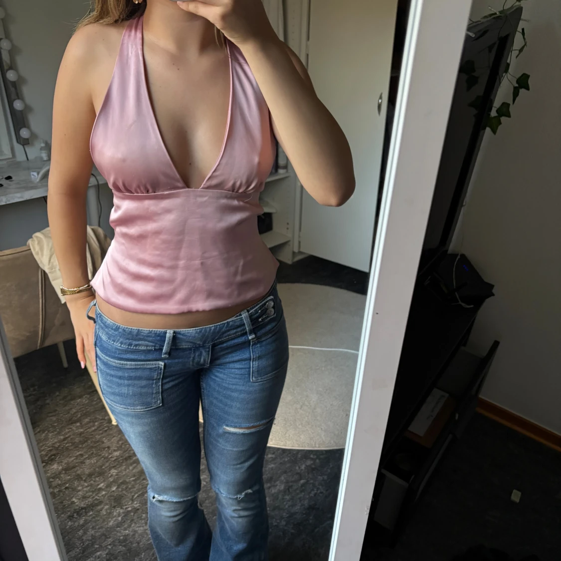 Säljer en ljusrosa halterneck topp i satin med djup v-ringning och omlottknytning i ryggen.