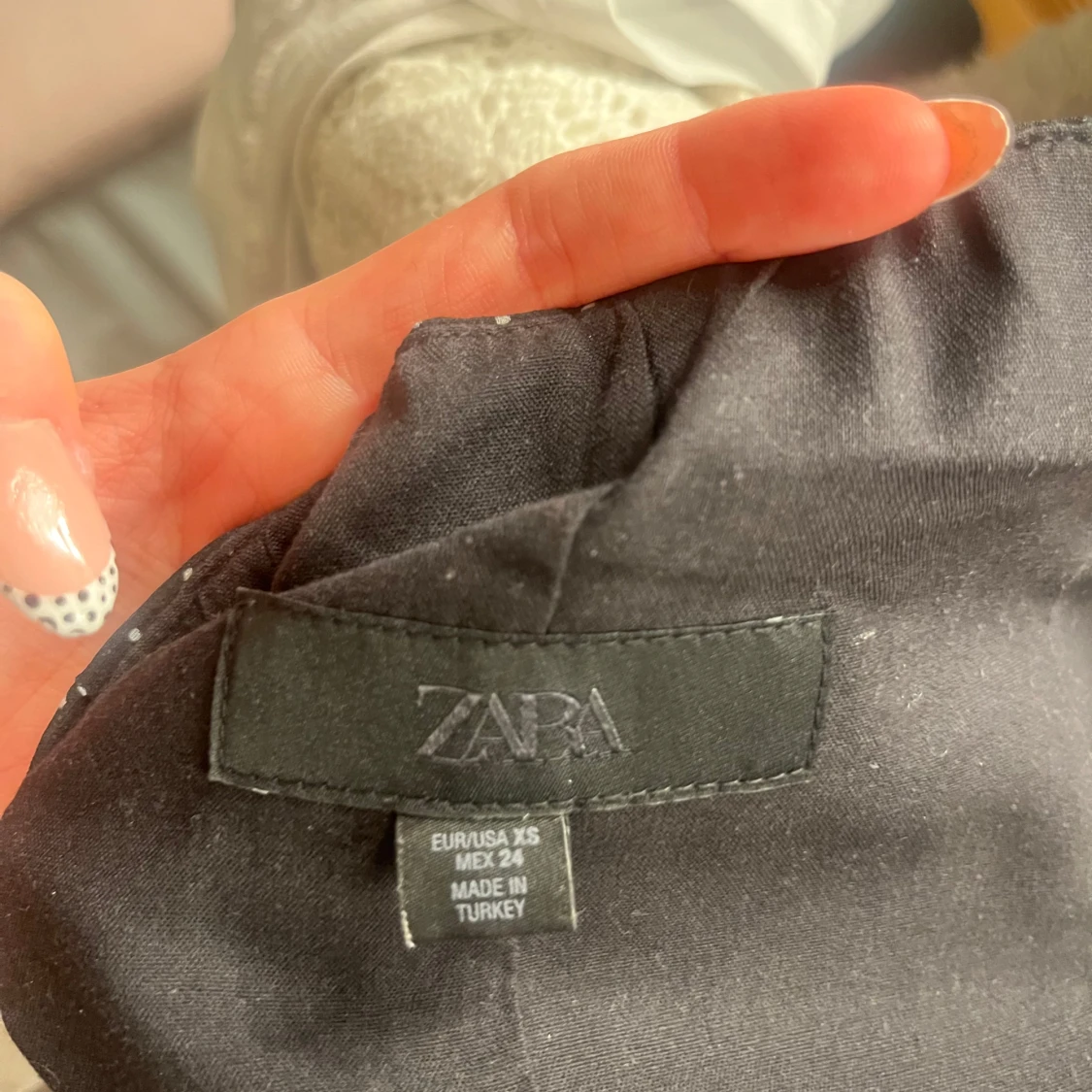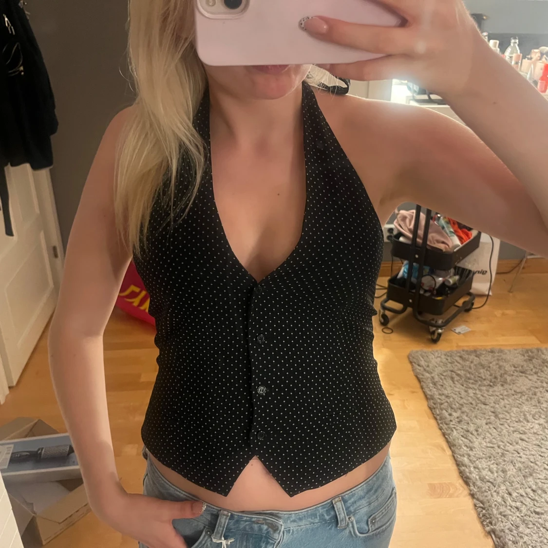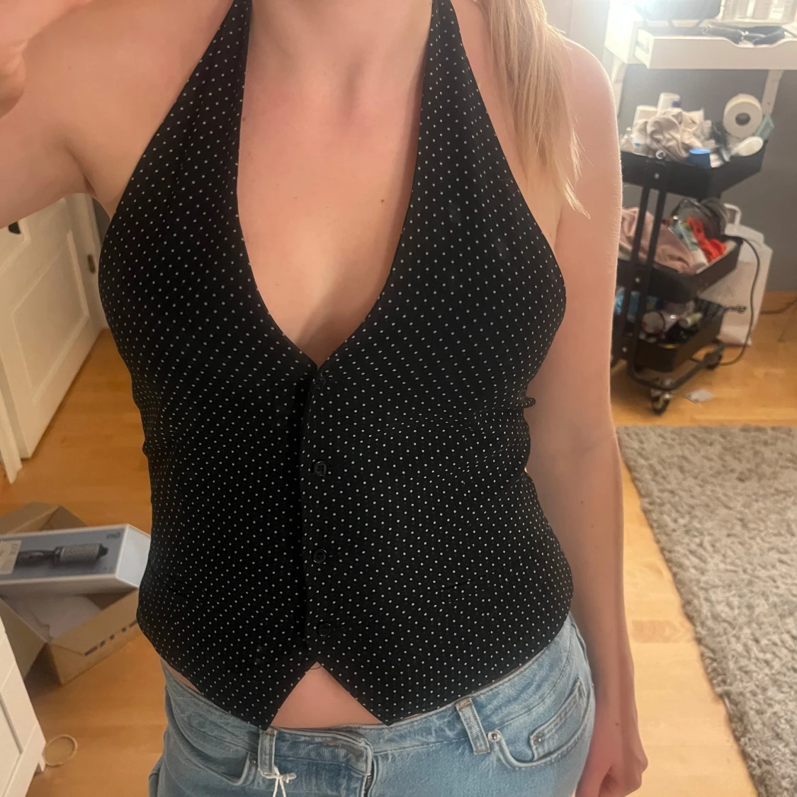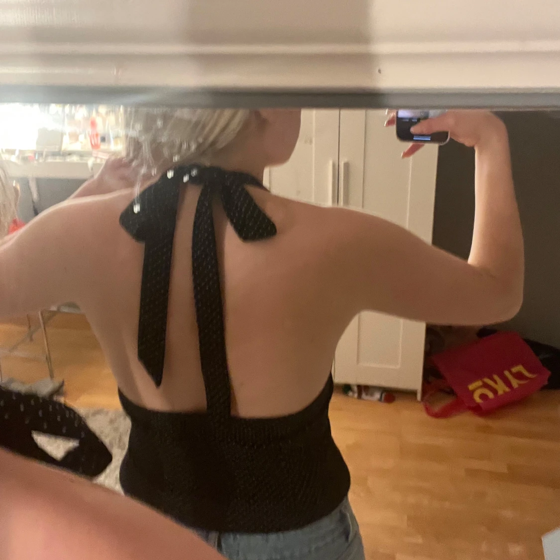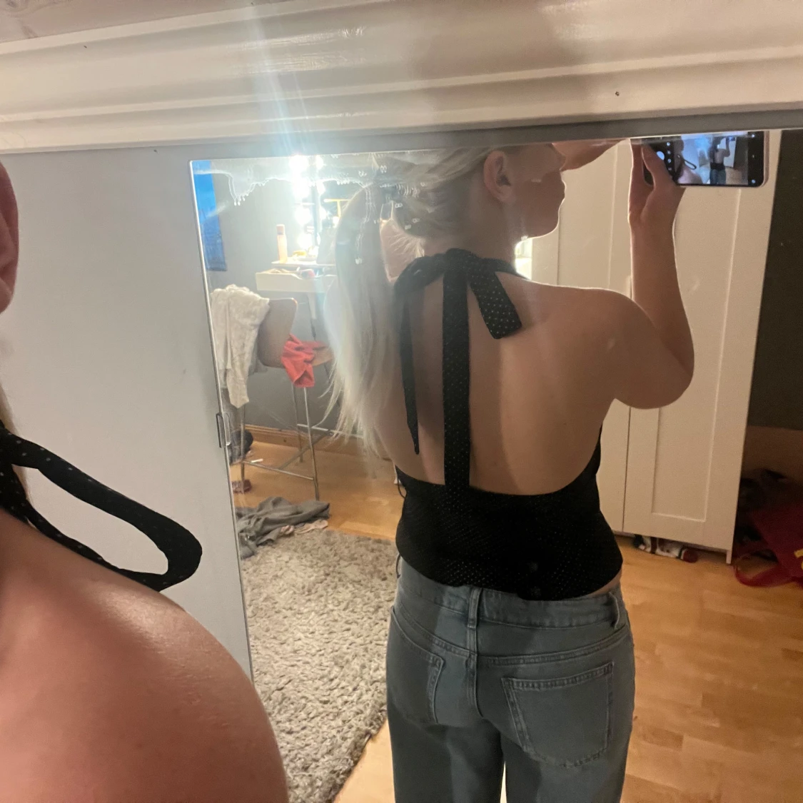 Säljer en svart halterneck topp med små vita prickar. Toppen har djup v-ringning, knäppning framtill och knyt i nacken. Modellen är croppad och har öppen rygg, vilket ger en snygg och trendig look. Perfekt till jeans eller kjol. Från zara!!