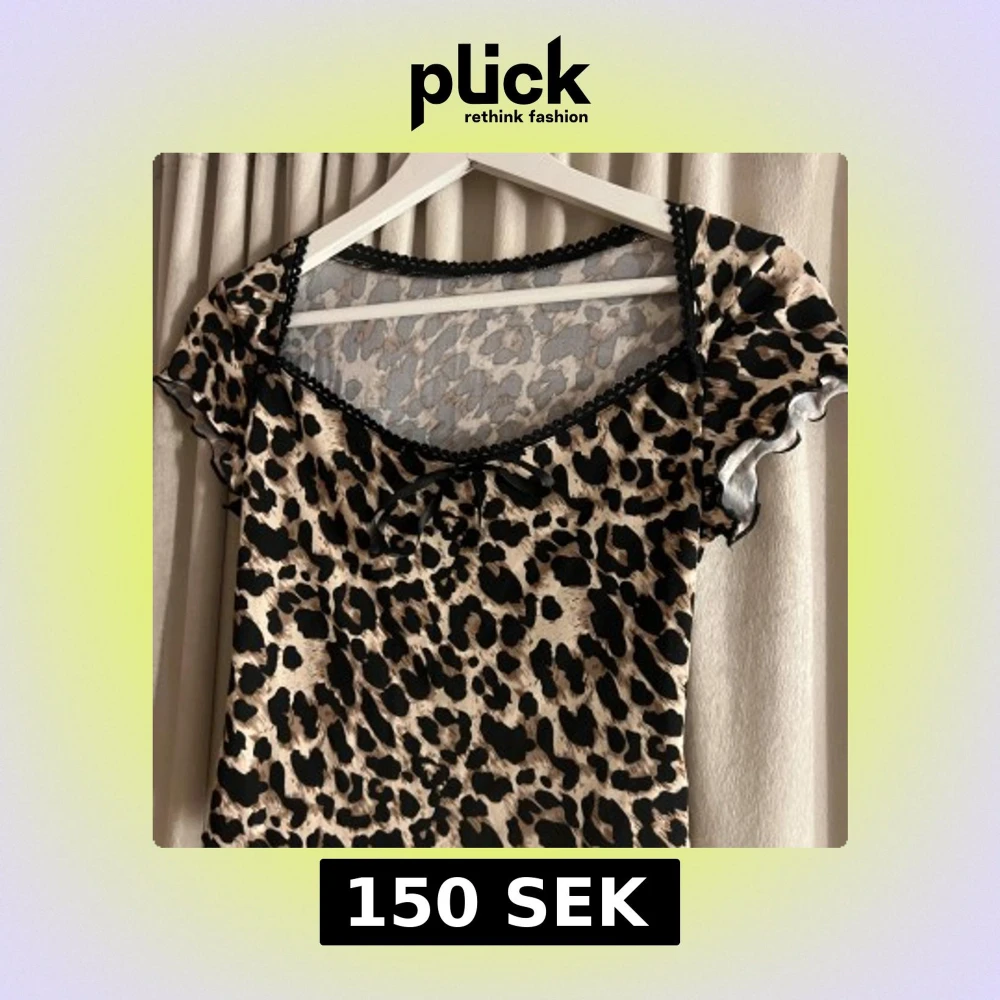 Snygg leopardmönstrad topp med svarta spetsdetaljer och en liten rosett framtill. Supersöt sommartopp, skiv gärna om ni undrar nåt
