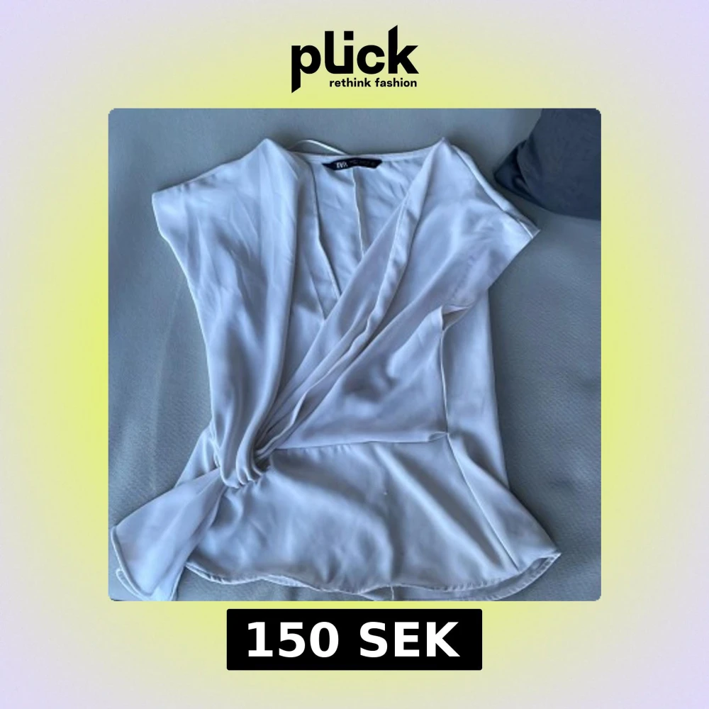 Säljer en vit omlottopp från Zara i storlek XS. Toppen har en snygg omlottdesign med knutdetalj i sidan och är tillverkad i ett mjukt, glansigt material som ger en lyxig känsla. Perfekt för dig som gillar stilrena och trendiga plagg.