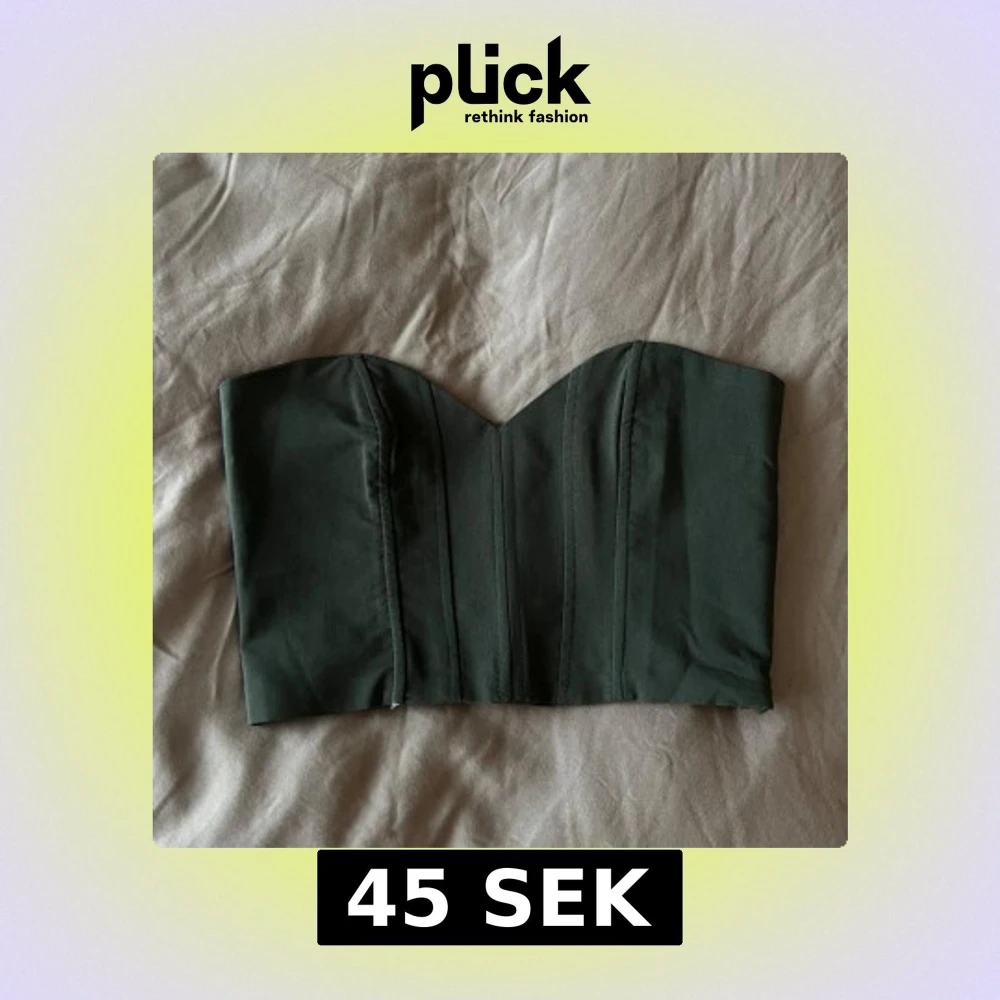 Säljer en mörkgrön korsettopp med markerade sömmar och hjärtformad urringning. Toppen är axelbandslös och har smockad rygg samt dragkedja i sidan. En liten defekt, de bild 3