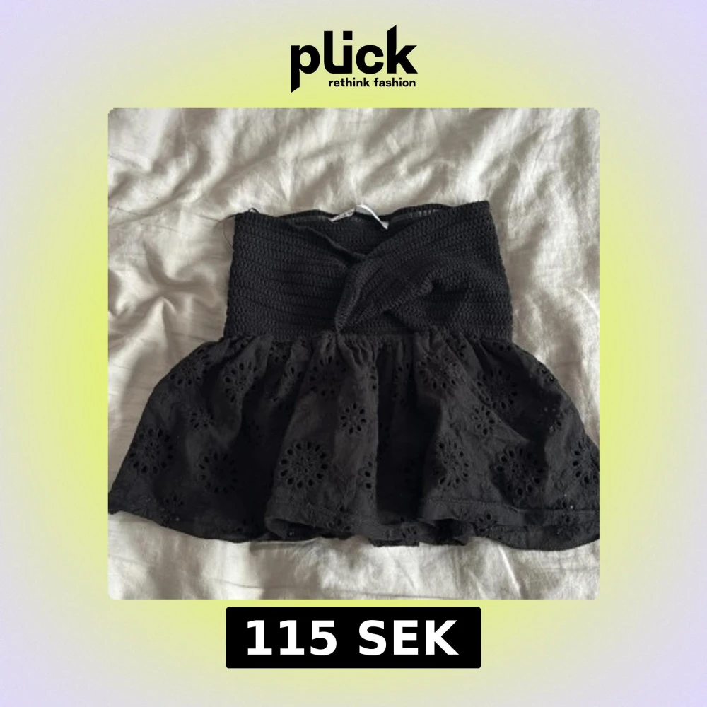 Supersöt svart bandeau tubtopp med smockad överdel och volangig nederdel i broderad bomull. Toppen har ett twistat parti framtill och fina blommiga broderier. Perfekt till sommaren och lätt att matcha med jeans eller kjol. Tyvärr för liten men verkligen så fin😻😻