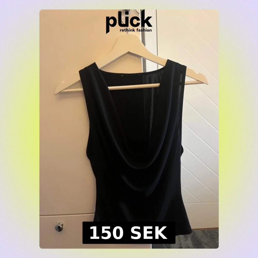 Stilren svart topp med draperad urringning, funkar super att ha åt båda hållen, de vill säga urringning en fram eller i ryggen! Toppen har en mjuk, följsam passform och är tillverkad i ett tunt, lätt material som ger ett snyggt fall. Endast använd vid en middag (lappen är avklippta för den skav)