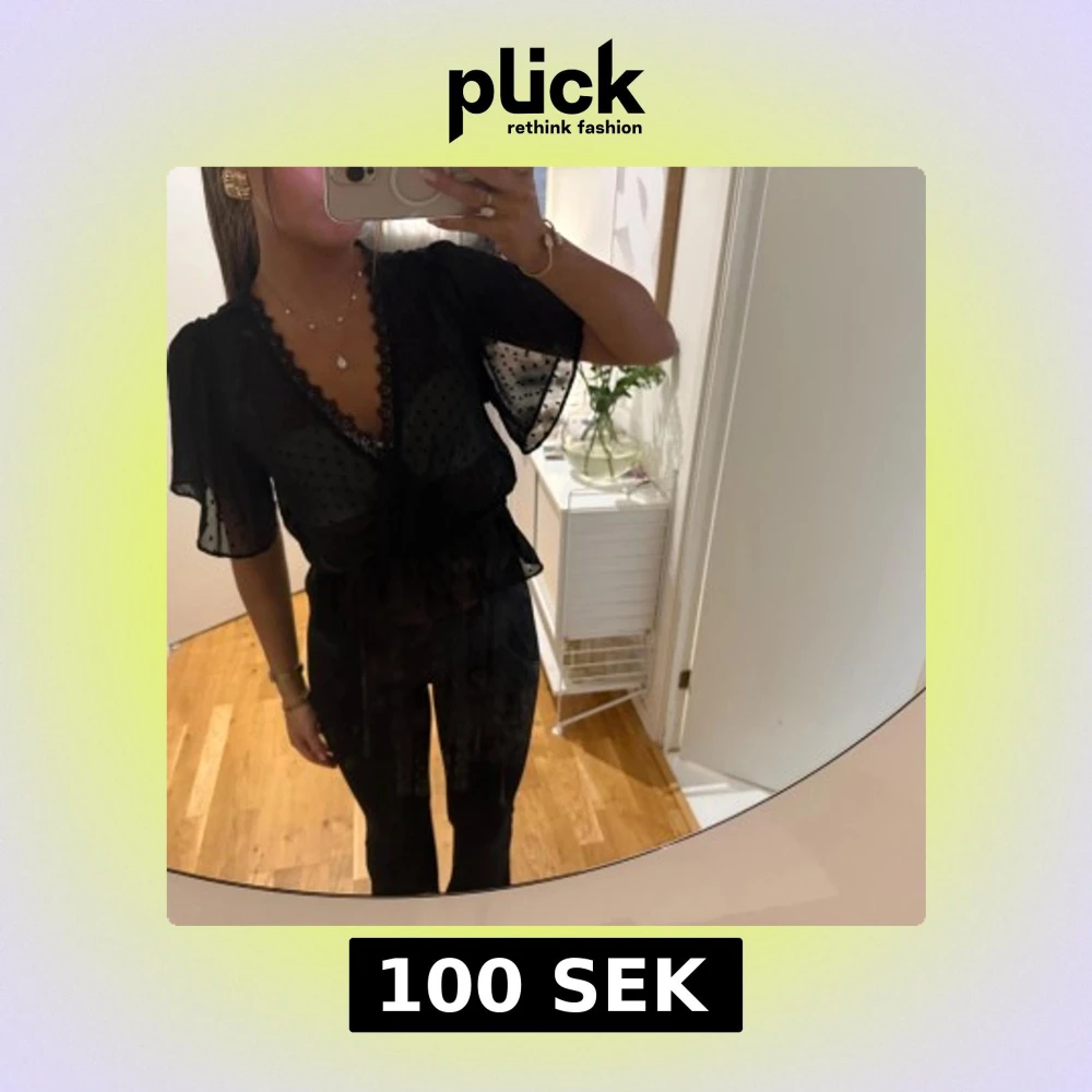 Säljer en svart blus i transparent material med prickigt mönster. Blusen har v-ringning med fin spetskant, korta vida ärmar och knyt i midjan. Perfekt för dig som gillar feminina detaljer och en luftig känsla.